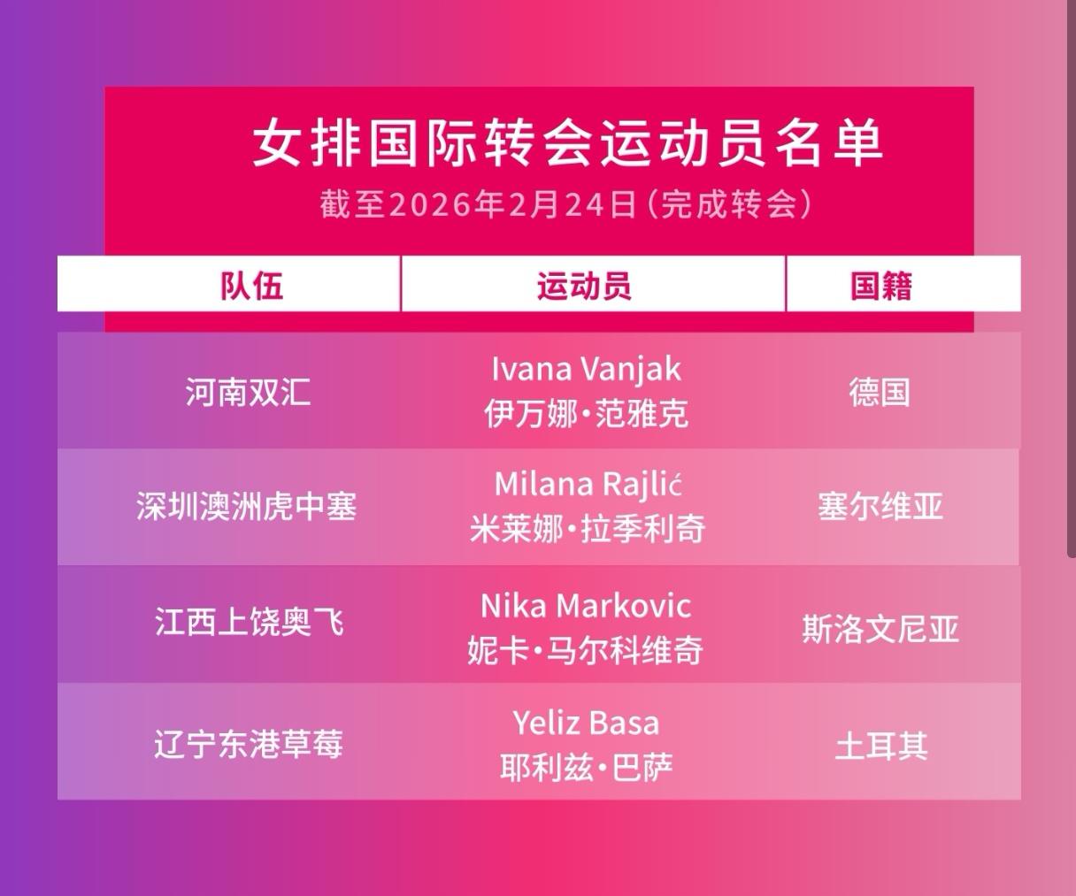 中国排超联赛引进第三排外援 今天中国排协公布了第三批外援名单,他们是: 河南女排:伊万娜·瓦尼亚克🇩🇪🇭🇷(Ivana Vanjak),主攻,1995/193,本赛季上半段先后效力于希腊奥林匹亚科斯、意大利佩鲁贾 深圳女排:米拉娜·拉伊利奇🇷🇸(Milana Rajlić),主攻,1997/187,本赛季上半段效力于希腊阿里斯 江西女排:尼卡·马尔科维奇🇸🇮(Nika Markovič),接应,1997/187,本赛季上半段效力于意大利佩鲁贾 辽宁女排:耶利兹·巴沙🇹🇷(Yeliz Başa),接应,1987/188,上赛季效力于美国圣地亚哥魔女(隶属于美国另一个职业排球联赛职业排球大联盟MLV) 上海男排:菲利普·兰扎🇮🇹(Filippo Lanza), 主攻,1991/198,上赛季效力于意超西斯特纳 女排联赛外援