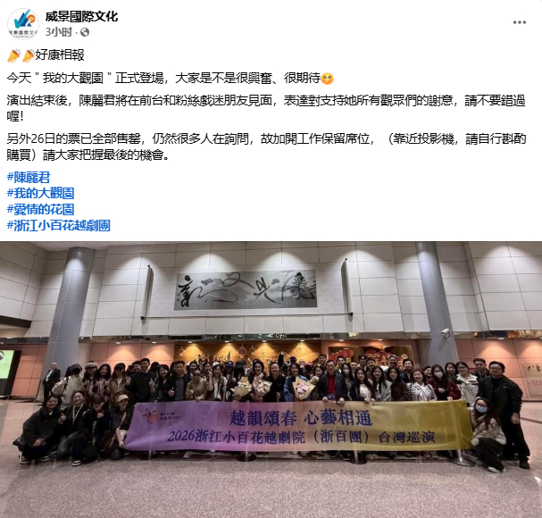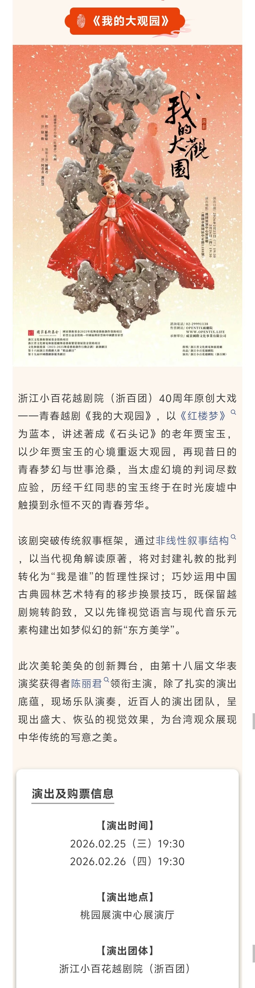 【陈丽君把我的大观园带到台湾】陈丽君台湾越剧演出已售罄 台湾的朋友们也能在现场看到越剧《我的大观园》了!2月25日-26日晚,由领衔主演的青春越剧《我的大观园》将在桃园展演中心展演厅开演;而在2月27日,陈丽君将在台北带来《爱情的花园》越剧折子戏专场之一的《红楼梦·葬花吟》!据承办方威景国际文化消息,今晚《我的大观园》演出结束后,陈丽君还将在前台和戏迷朋友们见面,你是不是也很期待?