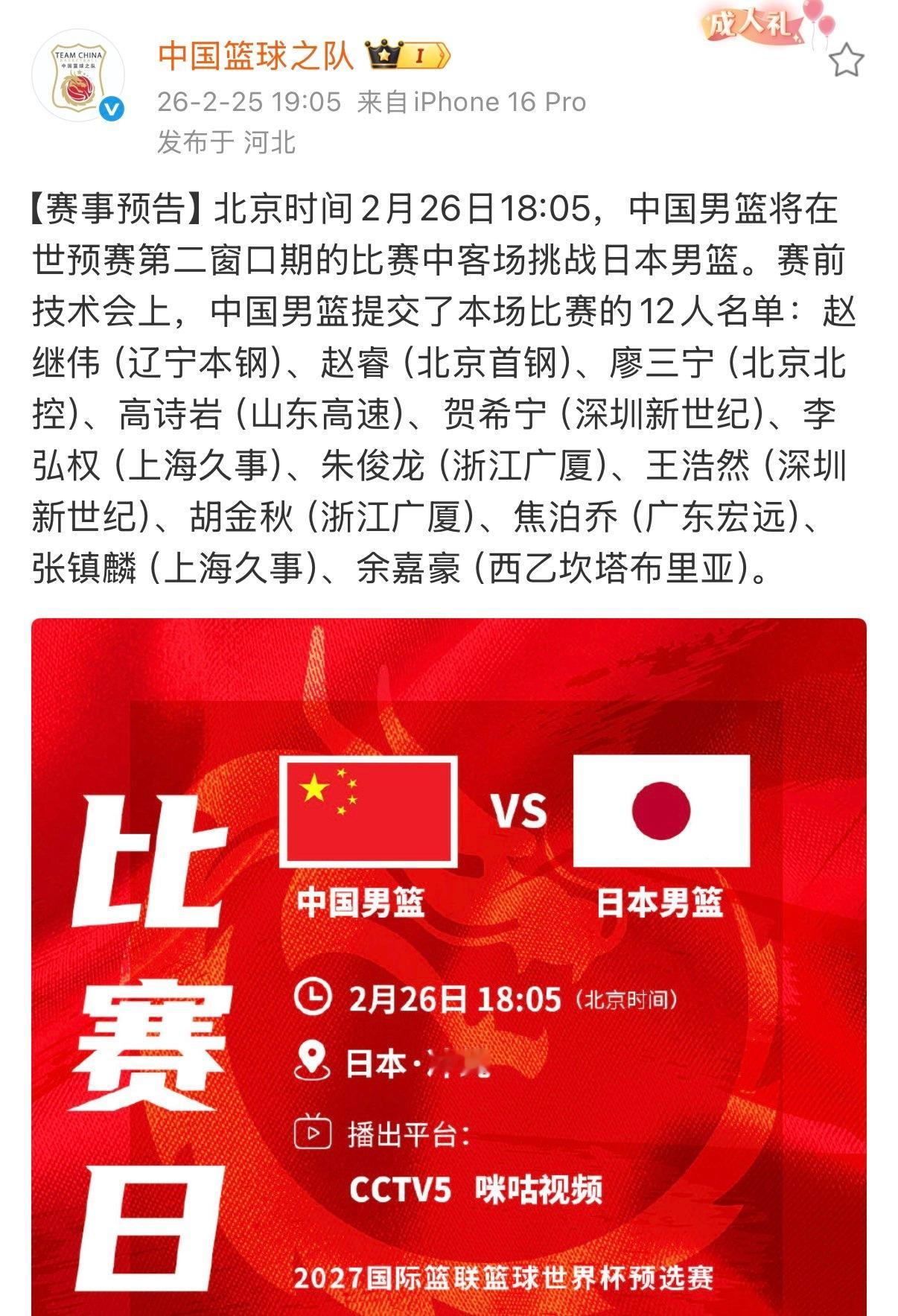 中国男篮公布客战日本名单中国男篮vs日本男篮 中国男篮公布出战日本男篮12人大名单——赵继伟、赵睿、廖三宁、高诗岩、贺希宁、李弘权、朱俊龙、张镇麟、王浩然、胡金秋、焦泊乔、余嘉豪。胡明轩、赵嘉义无缘出战日本男篮。 比赛将于北京时间2月26日18:05进行,中国男篮客场对阵日本男篮,此前第一窗口期,中国男篮主客场均不敌韩国男篮。