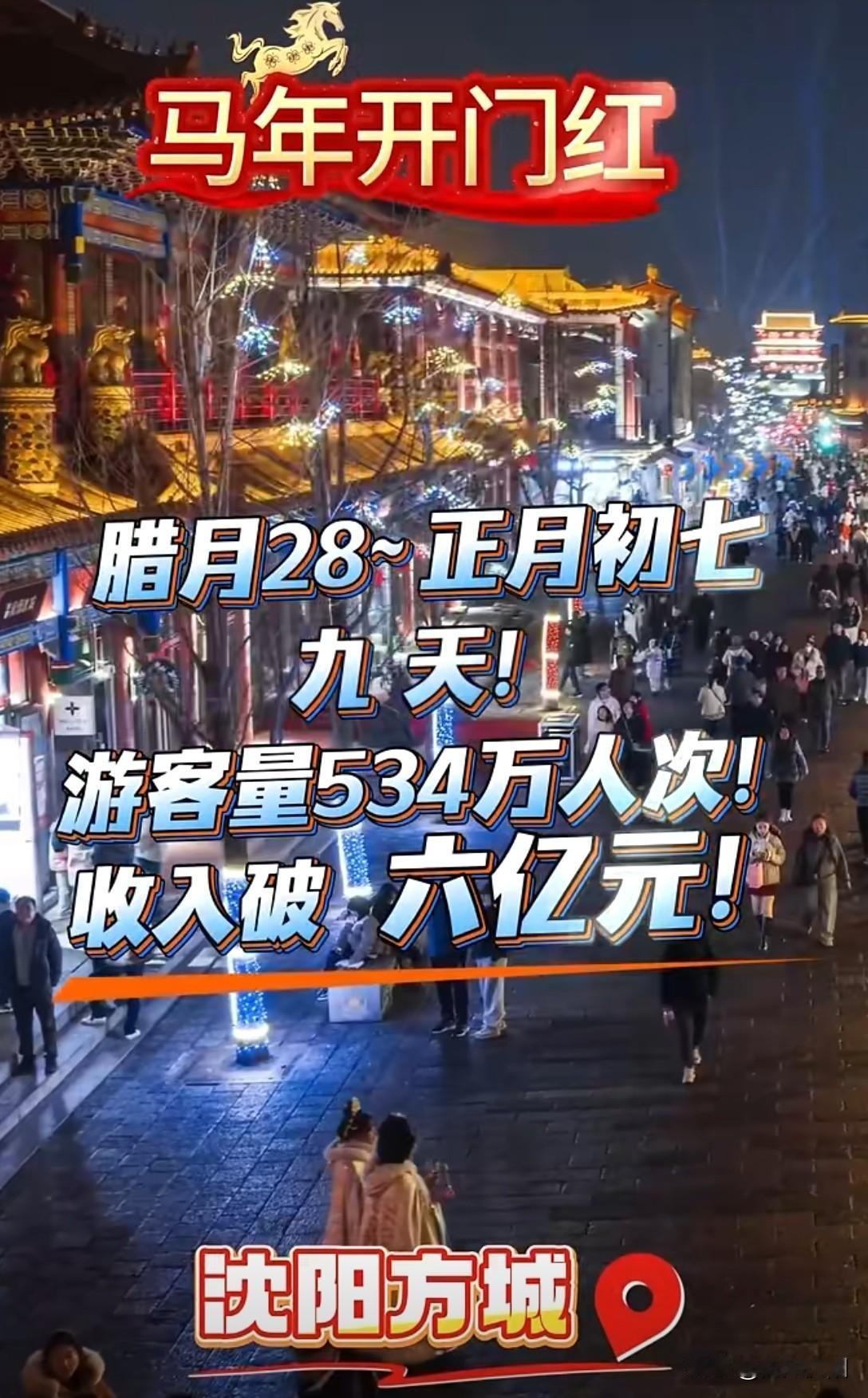 沈阳这波“赢麻了”!方城凭什么碾压式霸榜? 谁还敢说东北文旅只会“整活”?沈阳方城用实打实的成绩单,给全国上了一课! 马年新春,沈阳方城彻底点燃了“冰雪热情”,腊月二十八到正月初七短短九天,狂揽534万游客,收入直接破6亿!这份硬核数据背后,是中街步行街421万人次的人潮涌动,是沈阳故宫27万打卡量、同比暴涨56%的文化魅力,更是张学良旧居18万游客、增幅73%的红色吸引力。 有人质疑:“不就是靠流量堆砌?”可只有真正走进方城才懂,这里的火爆从不是偶然。是历史底蕴与现代潮流的完美碰撞,是老沈阳的烟火气与新文旅的用心经营双向奔赴。当别的城市还在照搬网红套路,沈阳方城早已把故宫红墙、中街烟火、民国风情揉成了独一无二的文旅IP。 从冷清街巷到顶流商圈,沈阳方城用实力证明,文旅的流量密码,从来都是真诚与底蕴。这波“开门红”,不仅是沈阳的高光时刻,更是东北文旅崛起的最强信号! 沈阳