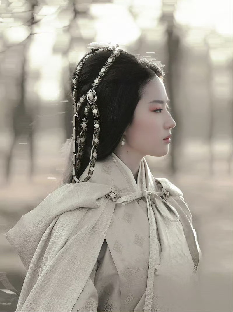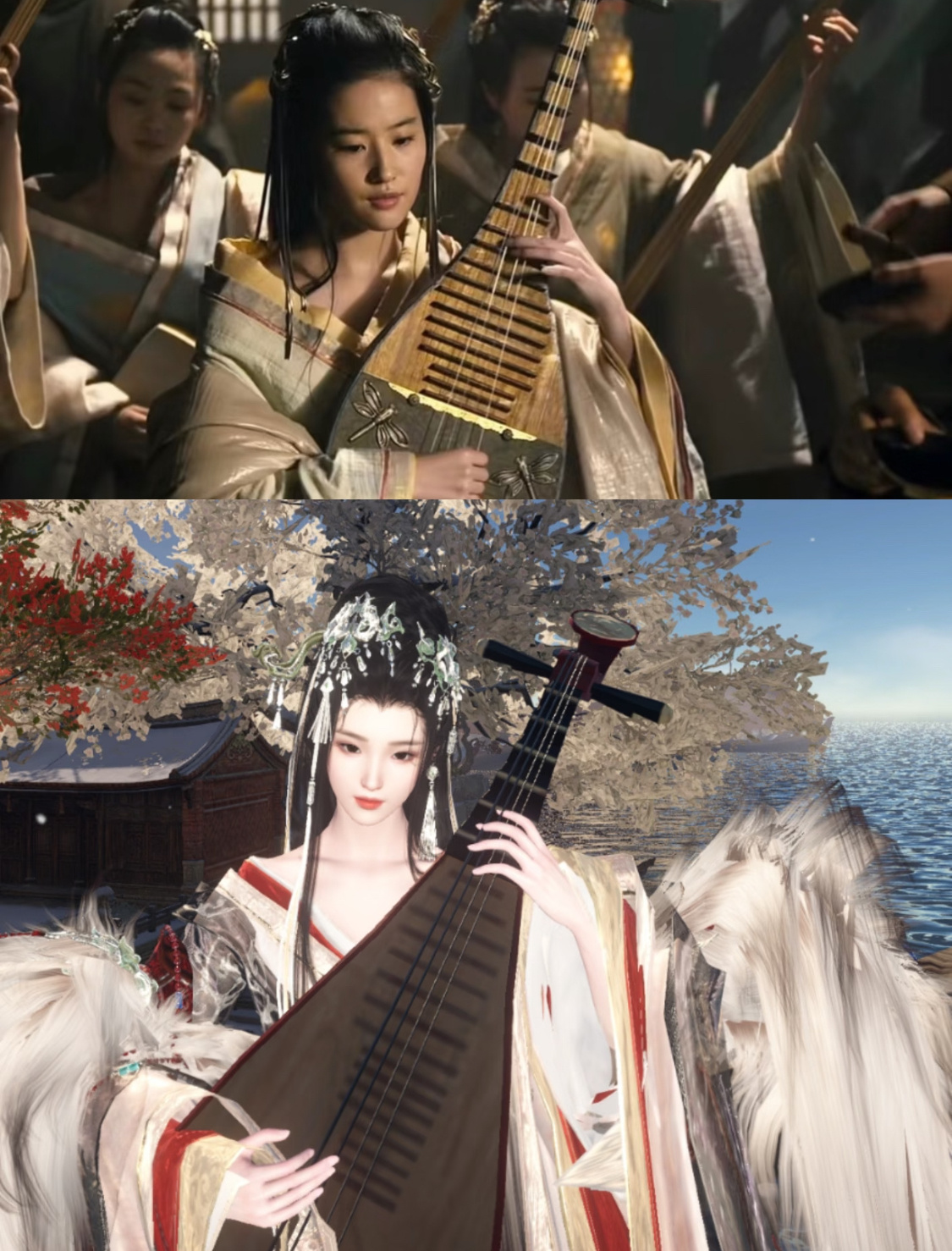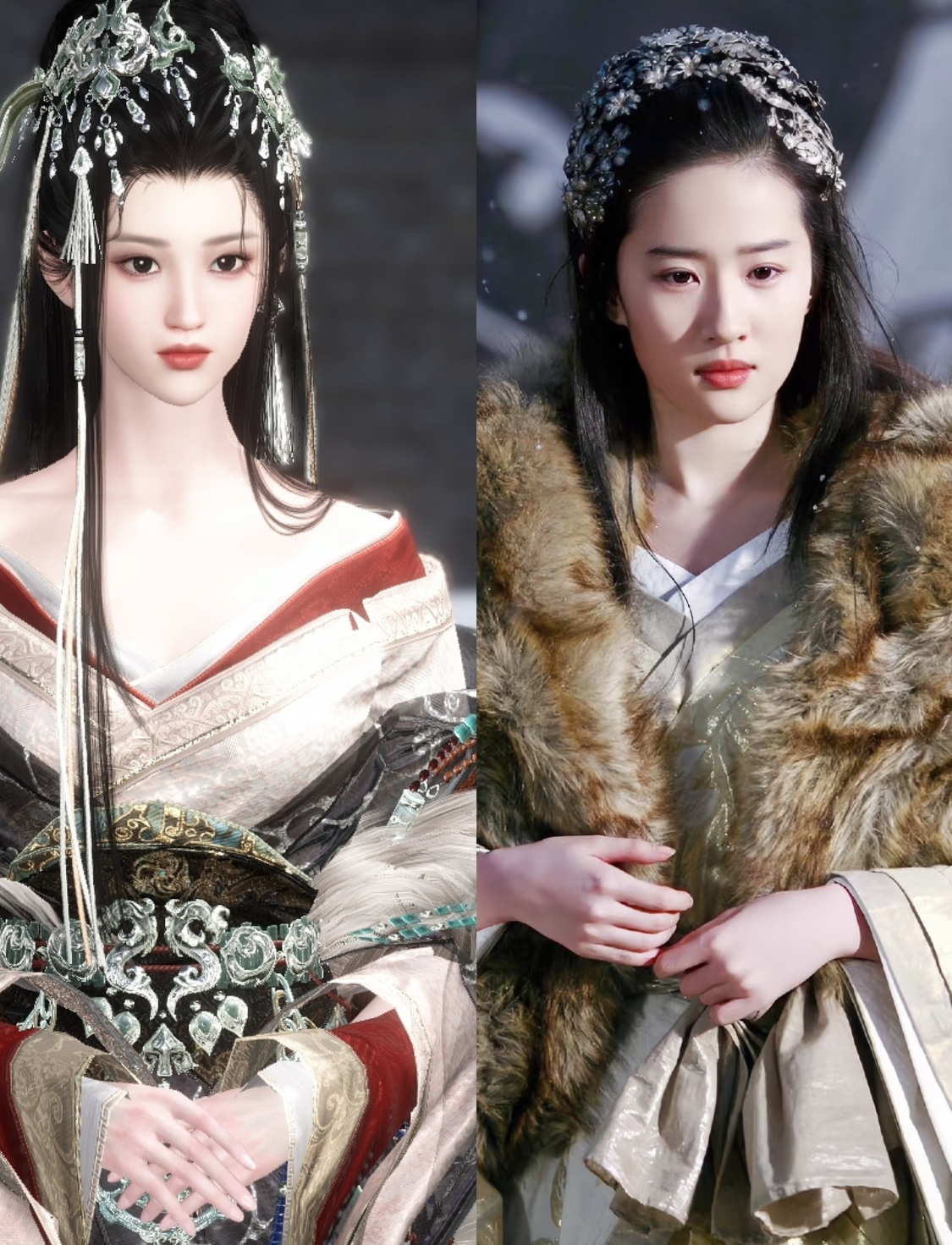 逆水寒的虞姬霸王都是很明显致敬的电影鸿门宴造型,尤其虞姬造型更是刘亦菲鸿门宴造型的服装款式,毛领,银饰,流苏发型合体,外加铜雀台灵雎的高颅顶发髻➕绝命逃亡莲公主的夹红袍。