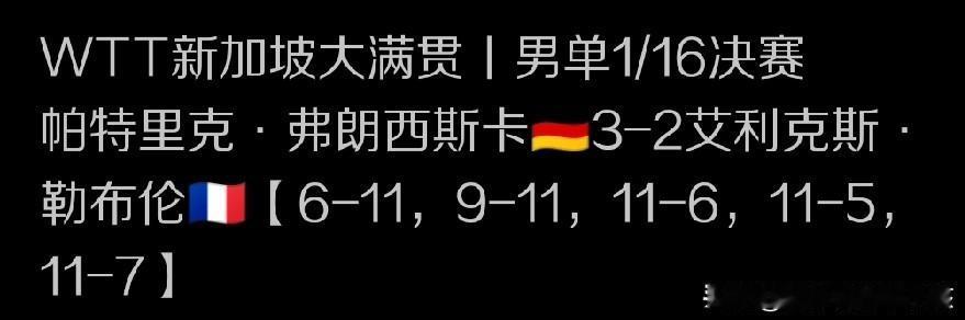 WTT,新加坡大满贯赛的赛场上,除了国乒球员和日本球员的比赛经常会引起我们的持续关注之外。法国和德国名将之间的交锋当中,特别是男队球员之间的交锋,也往往会吸引国乒球迷的关注目光。这主要是这两支球队是除了日本男乒还有韩国男乒之外,给国乒在世界大赛当中带来的竞争压力最大的团队之一。而且这两个团队之间的高手不但在欧洲赛场经常交锋,在世界赛场上也是互有胜负,每次打起比赛来场面比较热烈,同时胜负难料。 这次来自法国的名将勒布伦兄弟当中的哥哥艾利克斯勒布伦,就又迎来了和德国老将弗朗西斯卡之间的交锋。特别是在两位球员都参加过奥运会,而且未来还有很大可能继续参加奥运会的前提下,我们也需要关注一下这样的两位高手,进行正面对决时比赛会有怎样的走势。 比较有意思的是,埃艾利克斯勒布伦还是延续着他每次猛冲猛打的那种比赛风格。出手速度快场上动作灵敏,这也一度帮助他11:6、11:9先下两城,占据大比分上的2:0领先,似乎眼看着要把弗朗西斯卡逼入绝境。 不过弗朗西斯卡作为一个大赛经验丰富的老将,特别是见过各种大阵仗的知名高手,还是在后面逐步找到了比赛状态和节奏。不但连扳三城,而且每局比赛赢的分数也是比较明显,算是依靠自己的掌控力,把艾利克斯勒布伦的速度给压制住了。而艾利克斯勒布伦一旦心里着急开始出现各种失误,弗朗西斯卡的机会也就来了,他单板质量高,而且进入自己猛冲猛打的节奏之后出手效率也有保证的特点就体现出来了。他也分别以11:6、11:5和11:7的比分连扳三城,就此实现了3:2的逆转胜出,锁定一个男单16强的席位。 这样的一个弗朗西斯卡也确实需要引起国乒球员的持续关注,经常战满五局之后成为胜出者也成为弗朗西斯卡身上的一个新标签。 而艾利克斯勒布伦打比赛心态起伏明显,有时候影响个人技术发挥的问题也依然存在。就看后面国乒球员能否挡住弗朗西斯卡前进的道路,争取在了这种高手面前证明实力和进步了。