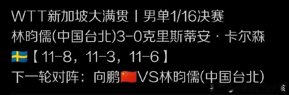 WTT新加坡大满贯赛的赛场上,近期林昀儒在进行技术革新之后,在世界赛场上的竞争力还是在不断提升。而且刚刚进行的最新一轮的32强进16强的比拼当中,面对来自瑞典的老将卡尔森,林昀儒也是延续了自己的好状态。可以说没给对方太多机会,以11:8、11:3和11:6的比分相对轻松的就拿到了一场完胜,也就此锁定一个男单16强的席位。 而林昀儒下一轮十六进八的对手,就将是国乒世界排名方面有所提升,而且也具备了一定稳定性的向鹏。按照最新一期出炉的世界排名,林昀儒现在是排在世界男单排名第8的位置,拥有的排名积分是2875分。而向鹏则比他少了250分,以2625分位列世界男单排名的第九位。这两位排名相当的球员在16进8争夺战战当中迎来正面交锋,对于两位球员来说,此役都很关键。 整体上来说,世界大赛经验,包括近期持续走高的态势,当然是林昀儒占据上风,但是向鹏这位球员比赛当中有时候起伏有点大,比如打好了,即使是王楚钦、林诗栋这种高手包括外协会的所有一流球员,都有可能成为向鹏的手下败将。不过,如果向鹏发挥不好,或者说陷入对方的节奏,场上一旦自己进攻端打不开局面,他的综合作战能力和各种应变的能力还是略显不足。这也有可能让他在比赛当中被对方带着节奏走,而难以在整个比赛当中找到得分机会,以至于迅速丢掉比赛胜利。 总之,这场林昀儒和向鹏之间的16进8争夺战,注定充满看点,关键还是要看向鹏能否把近期进攻状态越来越好的林昀儒给打到站不住位,或者打到在场上难以持续在对攻当中找到有效战术,向鹏就有机会在比赛当中胜拿到最后胜利。当然,如果双方按部就班的打,还是林昀儒更容易轻松取胜。那么大家如何看待近期林昀儒在世界赛场上的发挥,又对于林昀儒和向鹏即将在16进8争夺战当中的交锋有何看法呢?也期待朋友们给出自己心中的解读,大家共同交流探讨。