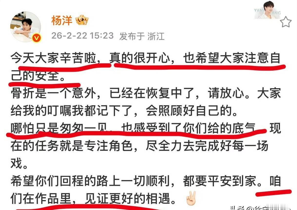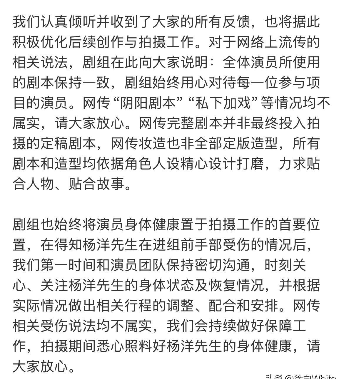 剧组声明墨迹未干,人已经拎着箱子走了。 他们嘴上说着一切安好,粉丝指着开机照的第二排站位和男配手上的加戏本子,没人信这套。 开机两天,问题炸了一堆。 大男主剧,杨洋被按在第二排,第一排站着男配。 合同签的是一回事,现场执行的又是另一套。 手受伤的消息刚漏出来,声明立刻扑上来“辟谣”,速度快得像排练过。 四天,从进组到离开。 够拍几场戏? 不够看清一个剧组的底色。 每天烧着巨资,演员离组是核弹级损失,但明知是坑还往里跳,代价更大。 这个圈子里,妥协是常态,但有些红线踩不得。 那不是耍大牌,那是给自己的职业生涯立界碑。 短期看是损失一个项目,长期看是保住所有项目的尊严。 你可以暂时站在第二排,但不能永远活在别人的剧本里。