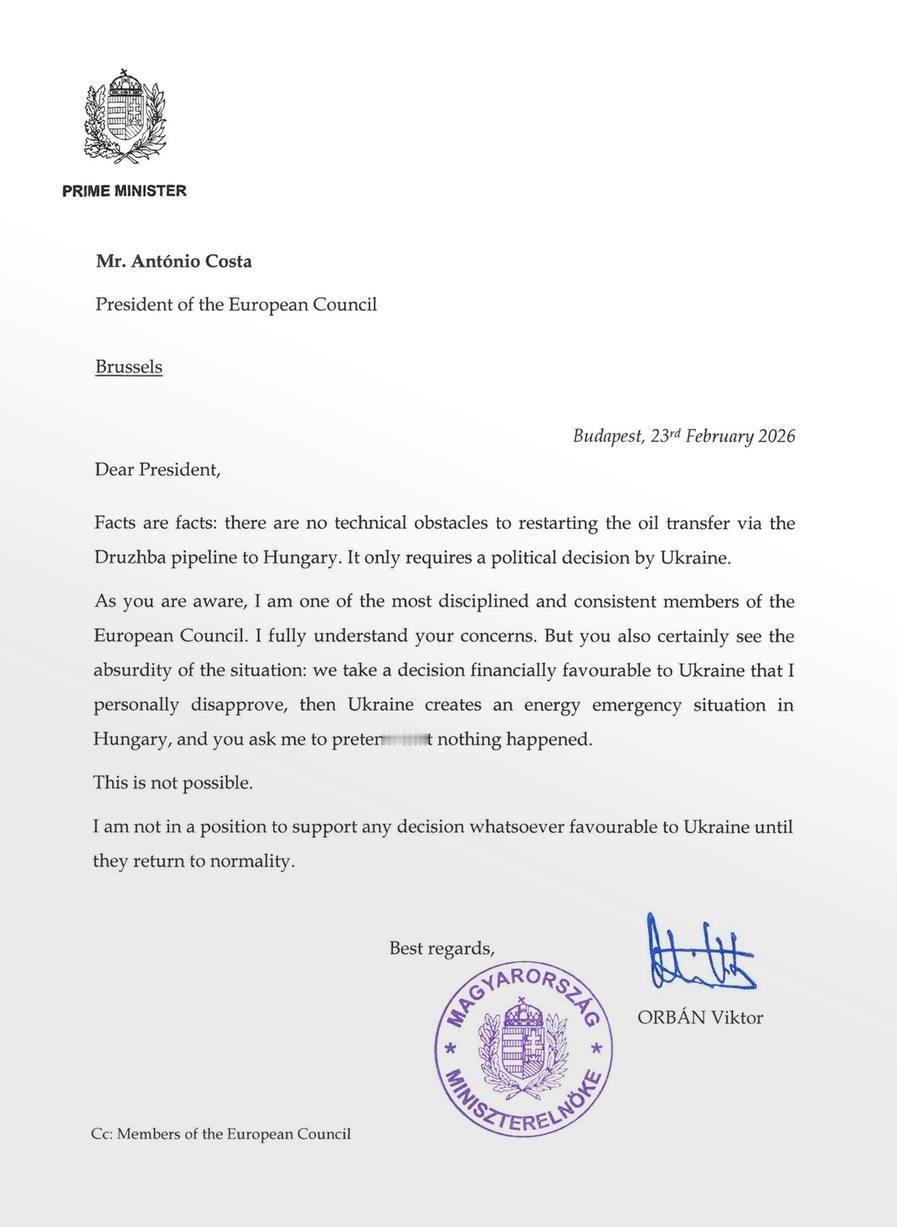匈牙利否决欧盟向乌克兰政府的贷款及对俄罗斯制裁: ▪️匈牙利总理欧尔班致信欧洲理事会主席科斯塔,拒绝支持向乌克兰提供900亿欧元贷款。匈牙利方面提出的条件是恢复俄罗斯“友谊”输油管道的过境运输。 ▪️欧尔班声称,恢复运输不存在技术障碍,任何问题纯粹是政治性的,且由乌克兰方面引发。 ▪️匈牙利目前不仅阻止贷款发放,还否决了对俄新制裁方案。而基辅方面坚称管道系俄罗斯破坏,并向欧盟承诺将公布修复时间表。