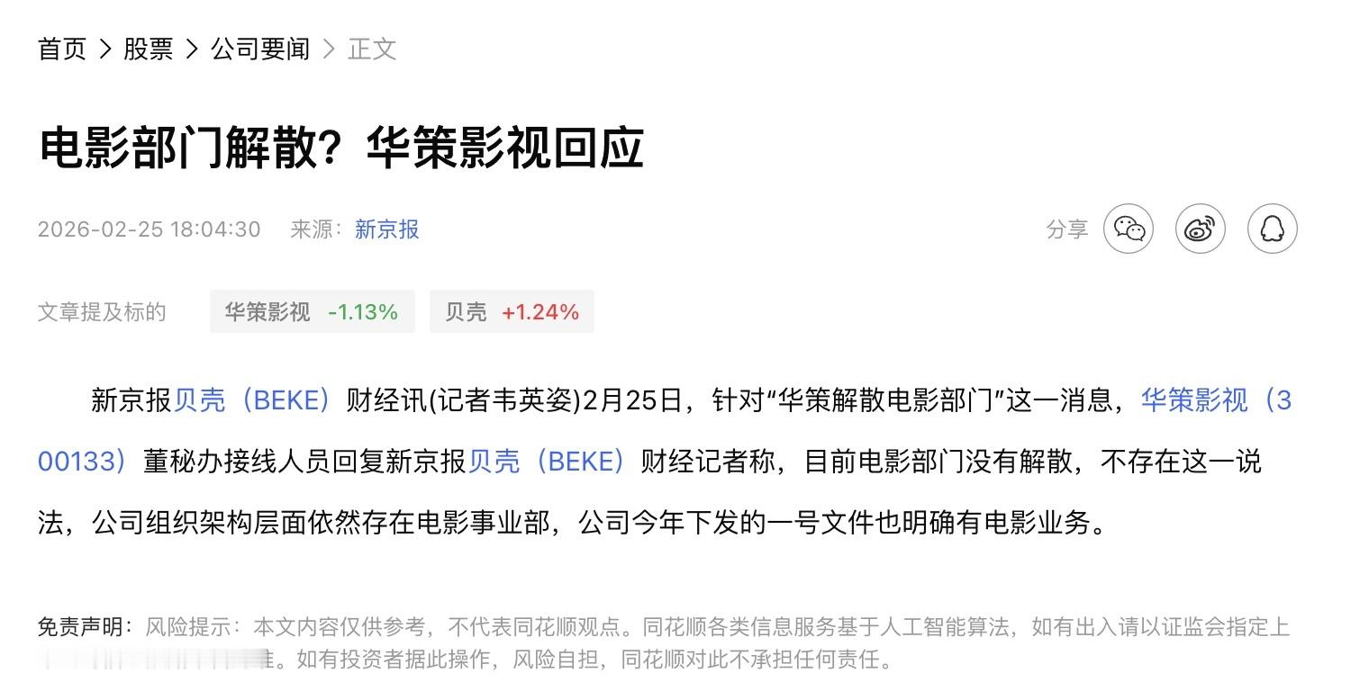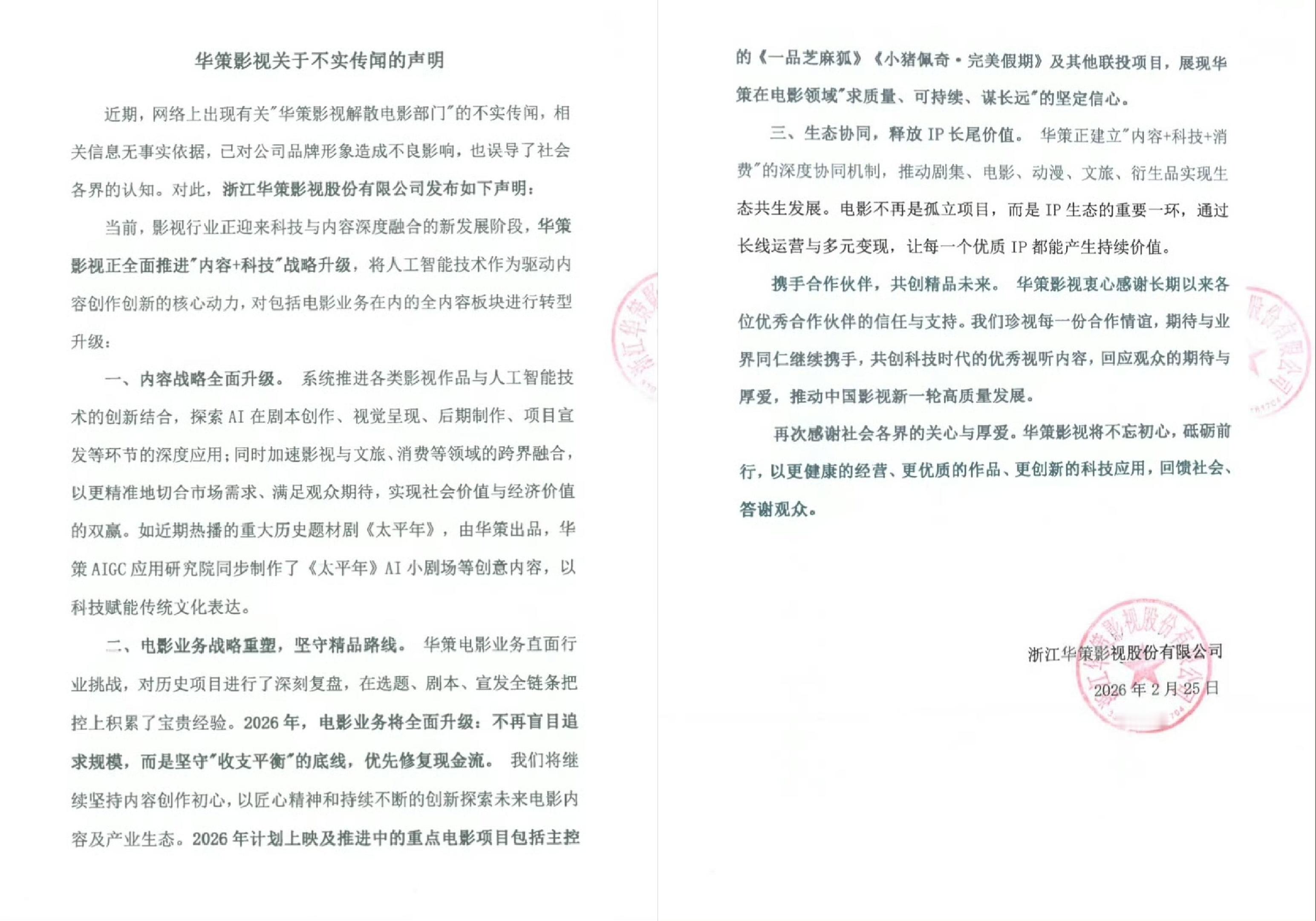 2月25日晚,针对近期网传消息,华策声明否认“解散电影部门”,并称将探索AI在剧本、后期制作等环节应用,2026年电影业务全面升级,不盲目追求规模,优先修复现金流。满谈娱乐