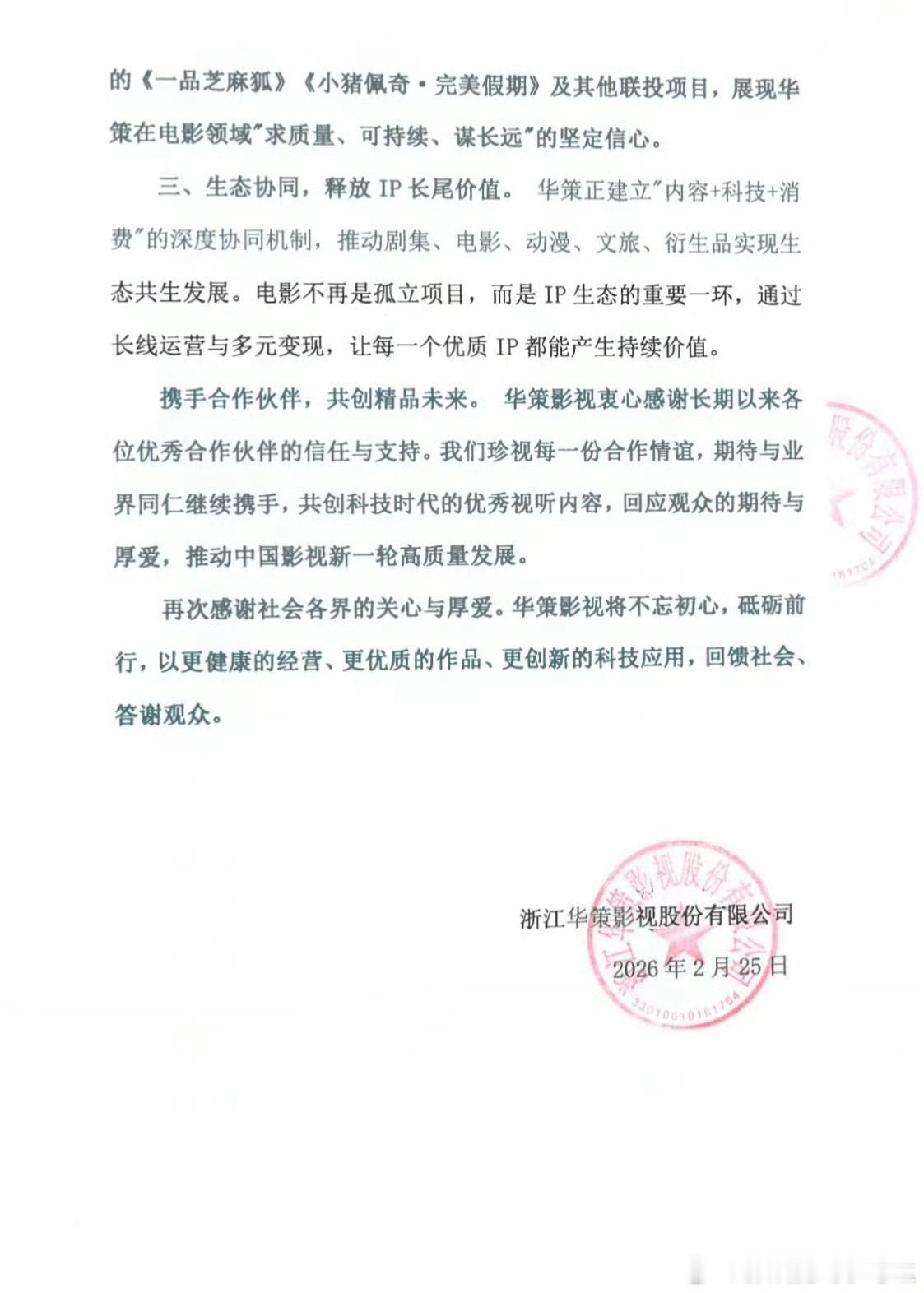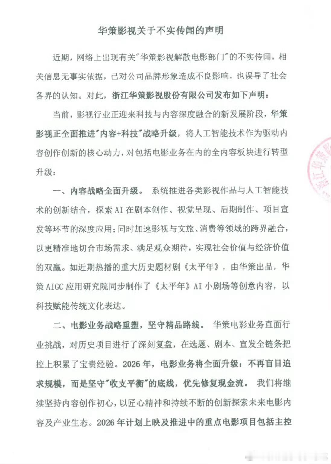华策声明华策声明解散电影部门的不实言论,华策影视强调,目前正全面推进“内容+科技”战略升级,是在对电影板块进行转型升级。华策影视依旧会坚守精品路线,进行生态协同,释放IP长尾价值↓↓