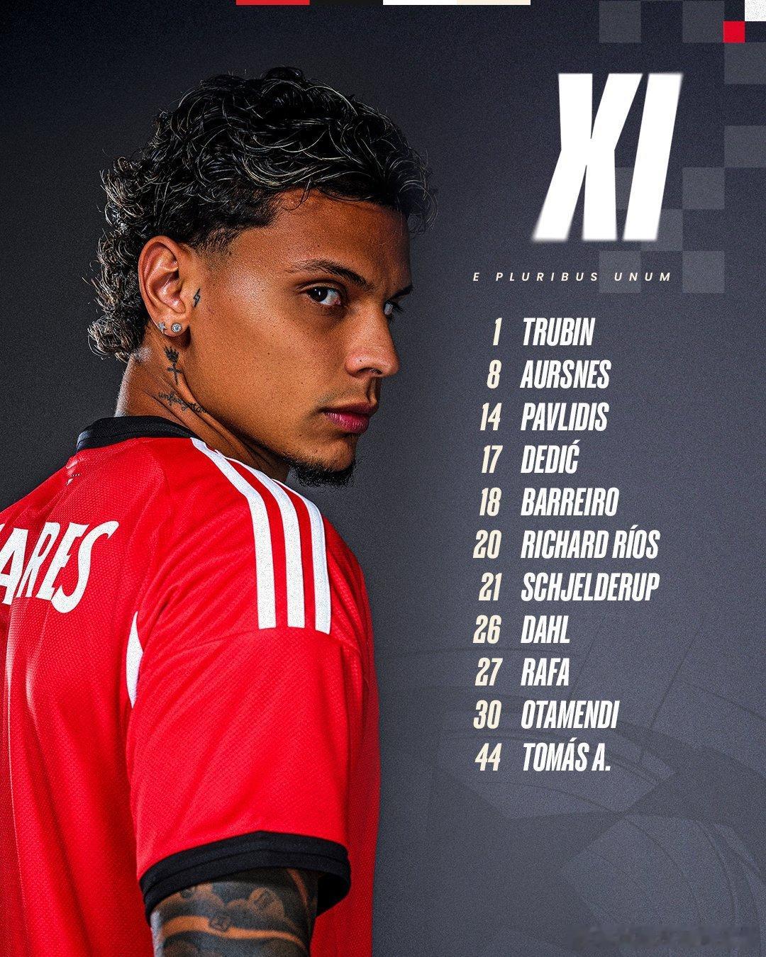 本菲卡首发:1-特鲁宾、44-托马斯·阿劳霍、30-奥塔门迪、17-德蒂奇、26-达尔、21-谢尔德鲁普、8-奥瑟斯、18-巴列罗、20-里奥斯、27-拉法·席尔瓦、14-帕夫利季斯