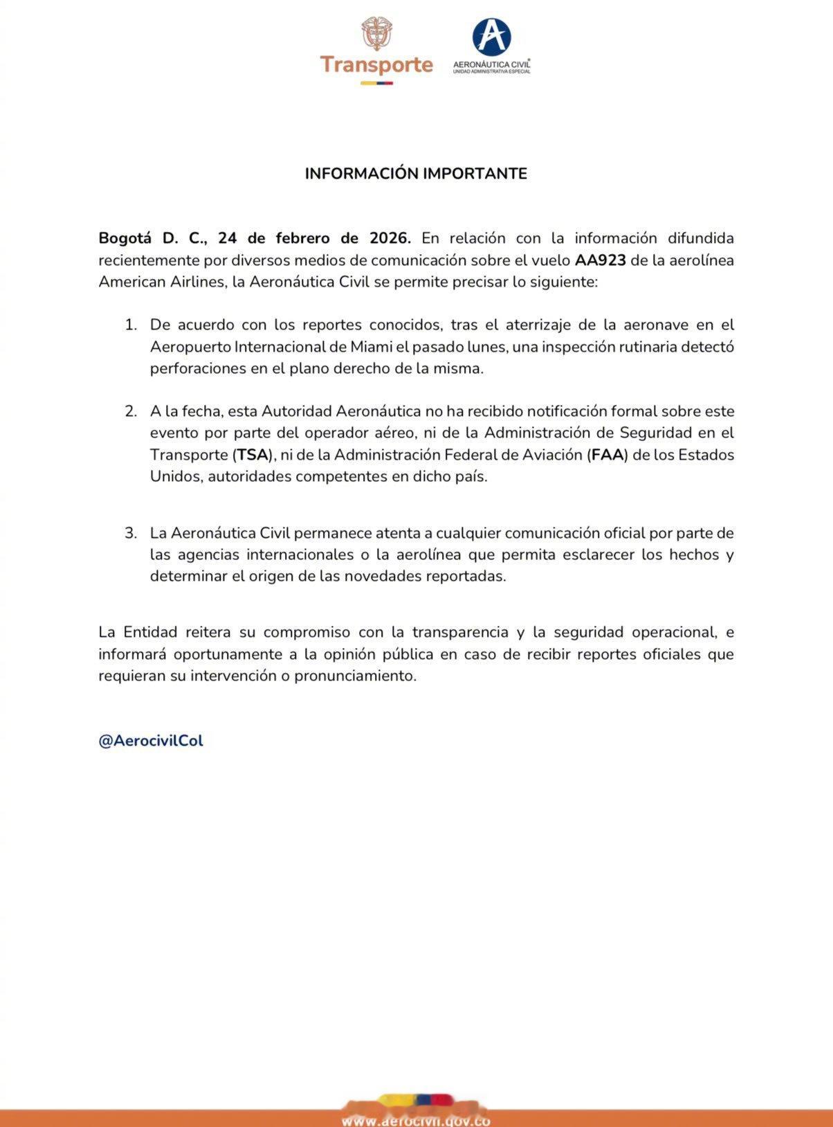 【飞机遭枪击,原来是飞中美洲,那倒也正常】周一,美国航空一架737 MAX 8(N342SX)执飞AA923航班从迈阿密飞抵哥伦比亚麦德林,在降落后的检查中机务报告右侧副翼上发现一个贯穿整个翼面的弹孔,除此之外在其他地方也发现弹孔。