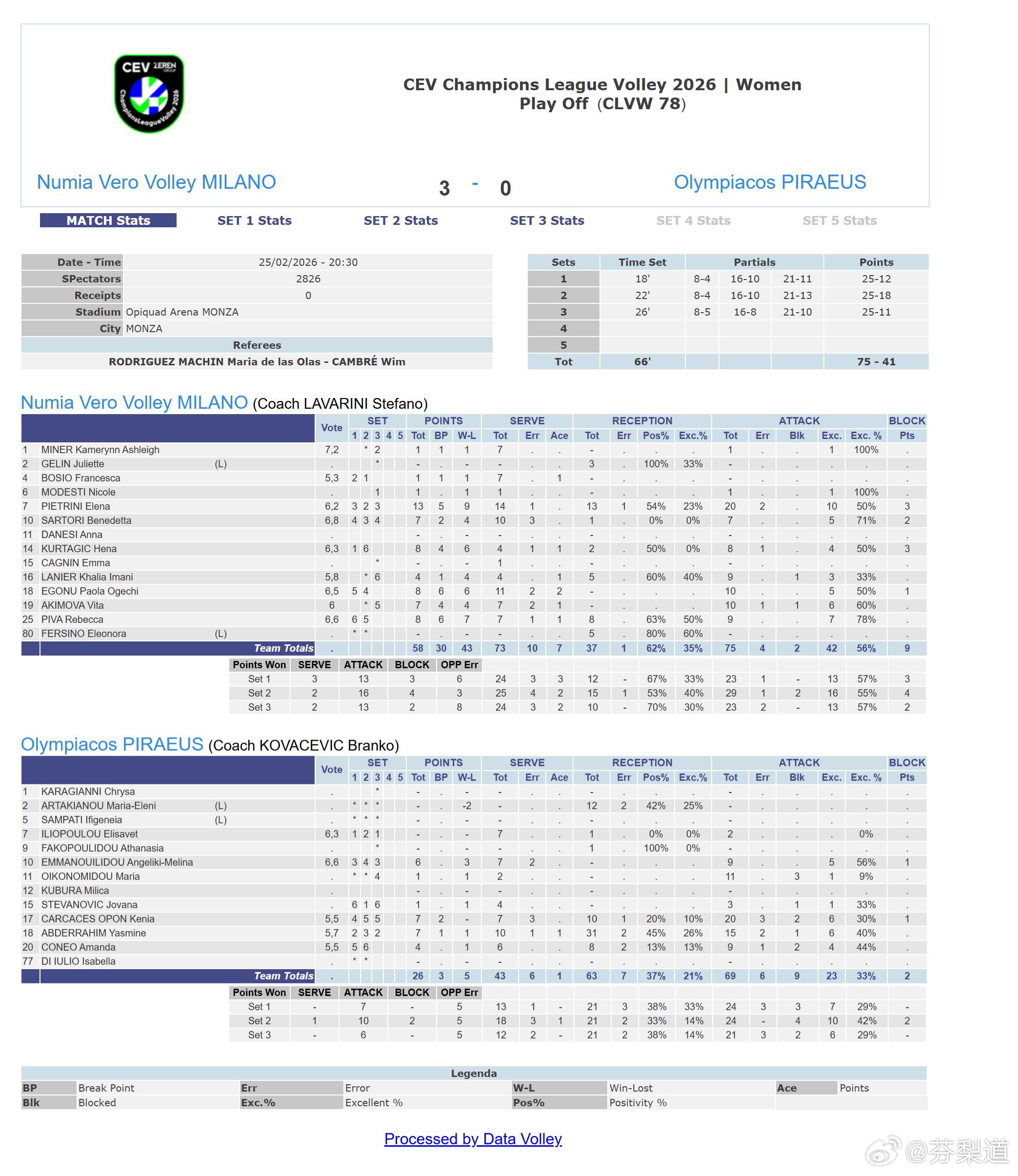 国际排坛动态艾格努米兰 3-0(25-12/25-18/25-11)奥林匹亚科斯2025-2026赛季女排欧冠附加赛次回合,米兰女排直落三局击败奥林匹亚科斯,两回双杀对手,晋级八强,1/4决赛米兰女排对阵瓦基弗银行队。米兰vs奥林匹亚科斯扣球:42-23;拦网:9-2;发球:7-1;自失:15-17 皮耶特里尼13分 20扣10中 3拦;库尔塔吉奇8分 8扣4中 3拦1发;艾格努8分 10扣5中 1拦2发;皮瓦8分 9扣7中 1发;阿基莫娃7分 10扣6中 1发;萨托里7分 7扣5中 2拦;拉内尔博4分 9扣3中 1发;莫德斯蒂1分 1扣1中;米纳尔1分 1扣1中;博西奥1分 1发卡尔卡塞斯7分 20扣6中 1拦;阿卜杜拉欣7分 15扣6中 1发;埃马努伊利杜6分 9扣5中 1拦;科内奥4分 9扣4中;奥伊科诺米杜1分 11扣1中;斯特瓦诺维奇1分 3扣1中