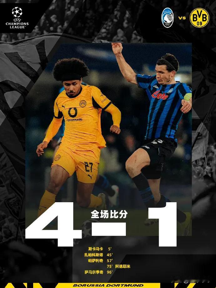 意甲最后的门面,亚特兰大4-1逆转多特晋级欧冠16强成为意甲独苗! 在亚特兰大与多特蒙德的欧冠淘汰赛附加赛次回合比赛中,首回合亚特兰大0-2不敌多特蒙德,球迷以为意甲要全军覆没了,毕竟首回合附加赛意甲全都输球了,而且领头羊国米已经提前出局了。 但是万万没想到亚特兰大却不想提前回家,开场5分钟亚特兰大就闪电破门取得完美开局,半场结束前亚特兰大再进一球,大比分2-2扳平,保留了晋级的希望。 下半场亚特兰大继续进球,大比分3-2反超,但是多特蒙德也终于觉醒了,也取得进球大比分又3-3扳平,伤停补时阶段,亚特兰大赢得点球,最终4-1拿下比赛总比分4-3淘汰多特蒙德,成功晋级欧冠16强,成为了意甲独苗。 亚特兰大才是真正的“真篮黑”,为意甲赢得了脸面,避免了意甲全军覆没的耻辱,成为了意甲最后的门面。