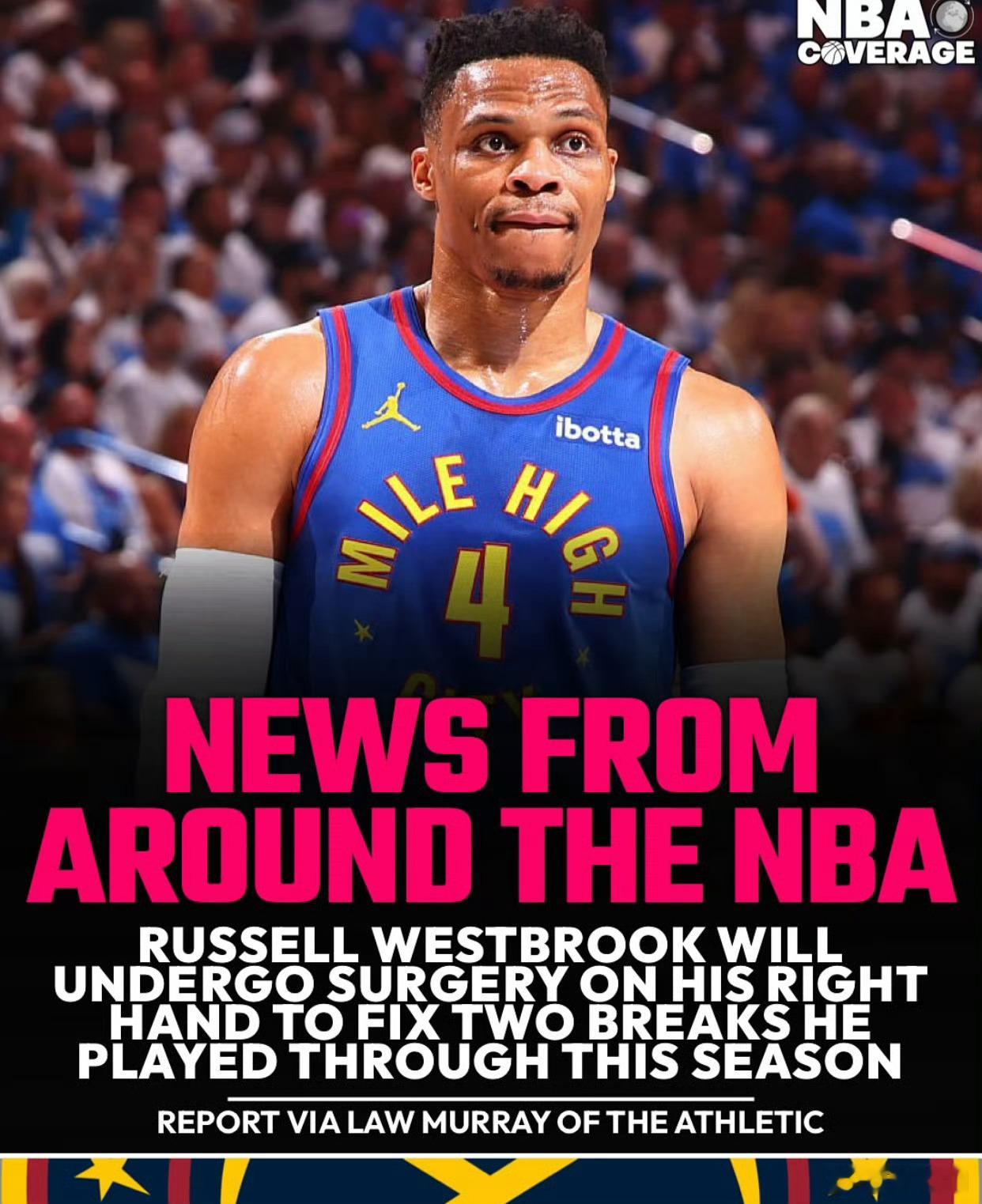 威少带着两处手部骨折,上赛季结束后,才接受接受右手手术,单臂擒哈登