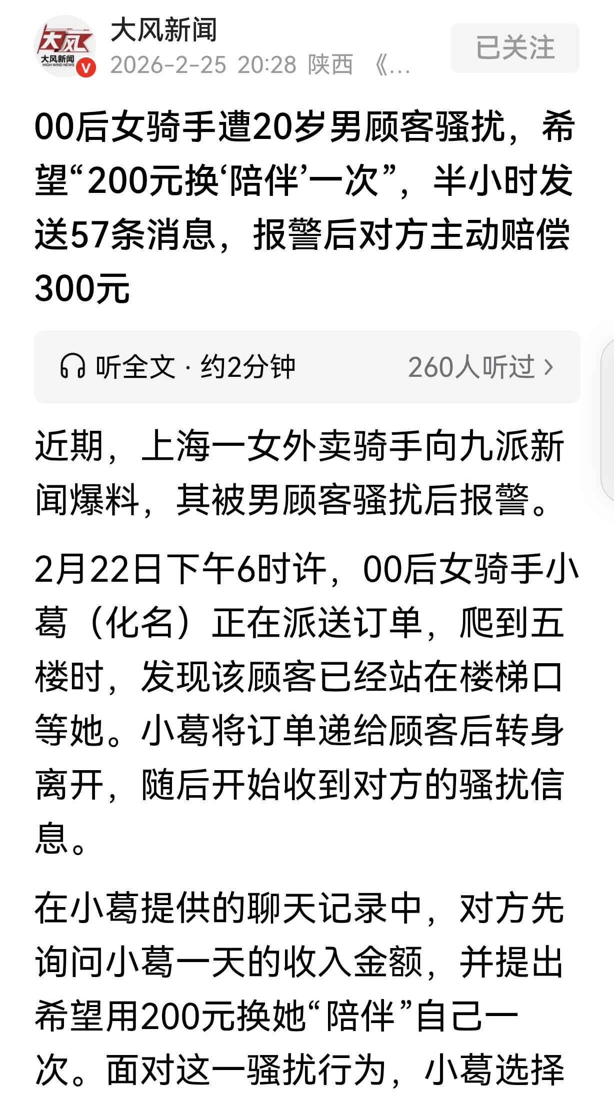 “00后又出幺蛾子了!”上海,女子是00后女骑手,她给一2岁男顾客送餐,对方看她长的漂亮,竟然给她发信息,问她一天能挣多少钱?他想出200元换“陪伴”一次,200嫌少的话,300也行。半小时给女子发了57条消息,导致她一生气差点没被车撞,女子愤怒报警,她不要赔偿,就希望男子受到惩罚,结果出乎意料。 一00后女子下班后,为了多挣点钱,就选择送外卖,晚上。她努力的身影,就出现在大街小巷,也会敲开千家万户的门。 2月22日那天下午六点多,她去送订单,那是一栋没电梯的老楼,她得爬楼梯到5楼。 当女子气喘吁吁爬到5楼,发现一20多岁男子已经等在楼梯口了。 女子把订单递给男子,转身就去忙下一单。 可她没走多远,手机消息提示有信息,她打开一看,发现是刚才送餐的男顾客发来的,问她在吗?还跟她叫“姐”。 女子心里一惊,以为餐出了什么问题,赶紧问对方怎么了? 男子问她送到几点,一天能挣多少钱?女子有点懵,不知道对方为啥这么问?自己挣多少钱跟他有啥关系?难道他也想做骑手,跟自己打听收入? 可接下来,男子的信息,直接让女子气的不轻,男子直言不讳的提出想用200块换她的“陪伴”,如果200不行,300也可以。 这是在侮辱谁呢?她凭自己劳动吃饭,又不是乱七八糟的人。 女子心里瞬间冒出一股火,没搭理对方,一心想着赶紧送单。 可对方像是没察觉到拒绝,接下来半个小时里发了57条消息,后台消息接连不断,她骑车时分心走神,差点被路过的车撞到。 女子越想越憋屈,她送完手里所有订单后立刻报了警。 报警后,女子才知道对方居然是自己老乡,是05年的,她当场表态,不要赔偿,就希望对方为行为付出代价。 最后在警察协调下,对方主动提出赔偿300元。她没客气收下了,觉得做错了事不能没成本。 后来她也没再被骚扰,这件事让她勇敢为自己发声。 她不觉得跑外卖低人一等,自己私下还有其他工作,收入并不差。被人欺负不能憋着,自己没错就该站出来,不能让坏人有恃无恐。 现实里不少女生遇到骚扰,怕麻烦或者觉得丢人就选择忍了,反而让骚扰者越来越嚣张。 这个女骑手的做法就很硬气,没因为对方是同乡就心软,也没觉得报警小题大做。 她用行动证明,面对恶意就得果断反击,才能保护自己,也给其他人提了醒。 这位00后女骑手的硬气,真该给所有被骚扰却不敢发声的女生做榜样。 很多人遇到这种恶心事,要么怕丢面子不敢声张,要么觉得报警太麻烦算了,结果反而让骚扰者越来越得寸进尺。 可她不一样,知道自己没错就立刻报警,就算对方是同乡也绝不心软。 更难得的是,她没觉得跑外卖低人一等。凭自己本事挣钱,不管是送外卖还是做其他工作,都值得尊重。 那些戴着有色眼镜,觉得骑手就可以被随意冒犯的人,本质上就是看不起劳动者,这种歪心思早该被戳破。 她收下300块钱不是为了这点钱,而是要让对方知道,做错事就要付出代价,这种态度比单纯拒绝更有意义。 《治安管理处罚法》第42条第五项规定,多次发送淫秽、侮辱、恐吓或者其他信息,干扰他人正常生活的,处五日以下拘留或者五百元以下罚款;情节较重的,处五日以上十日以下拘留,可以并处五百元以下罚款。 案例中,男子半小时发57条骚扰信息,已涉嫌干扰他人正常生活,应承担相应法律责任。 对此。你怎么看?