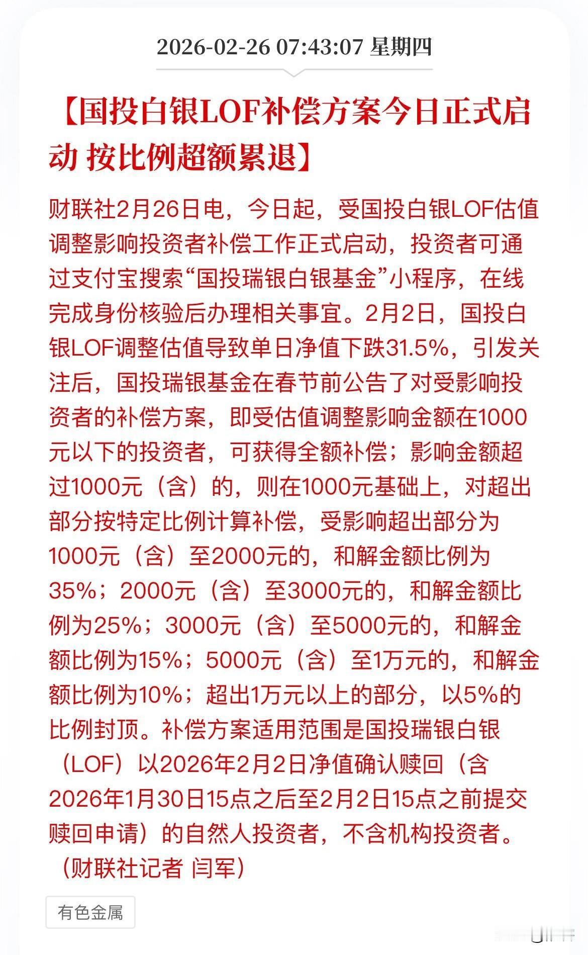 国内资本市场首次!国投白银LOF补偿方案正式启动。 蚂蚁虽小,也是肉啊! 这个事件补偿大小并不重要,重要的是开创了基金管理方对于金融消费者赔偿损失的先河,这将对接下来二级资本市场是一个示例作用。一方面警示基金管理人和上市公司切莫违背常规操作和做出损失投资的非常规行为。另一方面,对于二级市场的投资者来说,此次赔偿方案的落地可以作为后期因类似事件的参考。 事件背景与启动信息 1、事件起因:2026年2月2日,因国际白银价格剧烈波动,国投白银LOF(161226)调整估值,导致单日净值暴跌31.5%,引发投资者争议。 -2、补偿启动:2026年2月26日起,正式开放补偿申请。 补偿对象 1、适用人群:自然人投资者(不含机构投资者)。 2、交易条件:在2026年1月30日15点后至2月2日15点前提交赎回申请,并以2月2日净值确认赎回的投资者。 补偿方案细则(分层累退机制) 1、基本原则:按“估值调整影响金额”(即由-17%调至-31.5%的部分)进行分层计算。 2、全额补偿:影响金额在1000元以下的投资者,按实际影响金额获得全额补偿(覆盖超9成受影响投资者)。 3、分段累退补偿:影响金额超过1000元(含)的投资者,总补偿金额由两部分构成: (1)基础补偿:1000元全额补偿。 (2)超额补偿:对超出1000元的部分,按以下比例分段计算(超额累退): - 1000-2000元部分:按35%计算。 - 2000-3000元部分:按25%计算。 - 3000-5000元部分:按15%计算。 - 5000-10000元部分:按10%计算。 - 10000元以上部分:按5%比例封顶计算。 办理方式 1、渠道:支付宝搜索“国投瑞银白银基金”官方小程序。 -2、流程:在线身份核验 → 系统自动匹配数据 → 确认方案 → 签署协议 → 绑定银行卡收款。