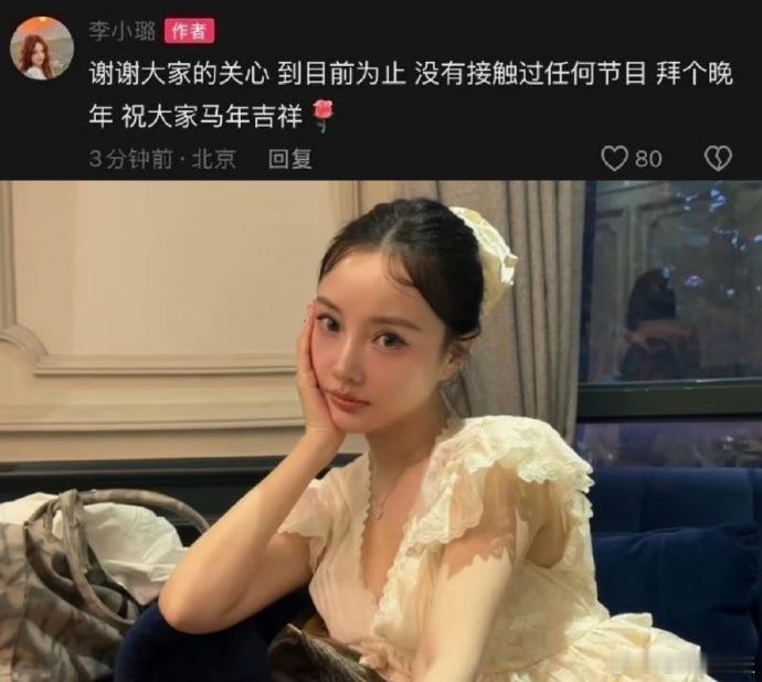 李小璐辟谣上浪姐李小璐不去浪姐7 李小璐回应浪姐传闻:目前为止没有接触过任何节目。唉,还挺想看她站在舞台上的,感觉会是很不一样的风景。