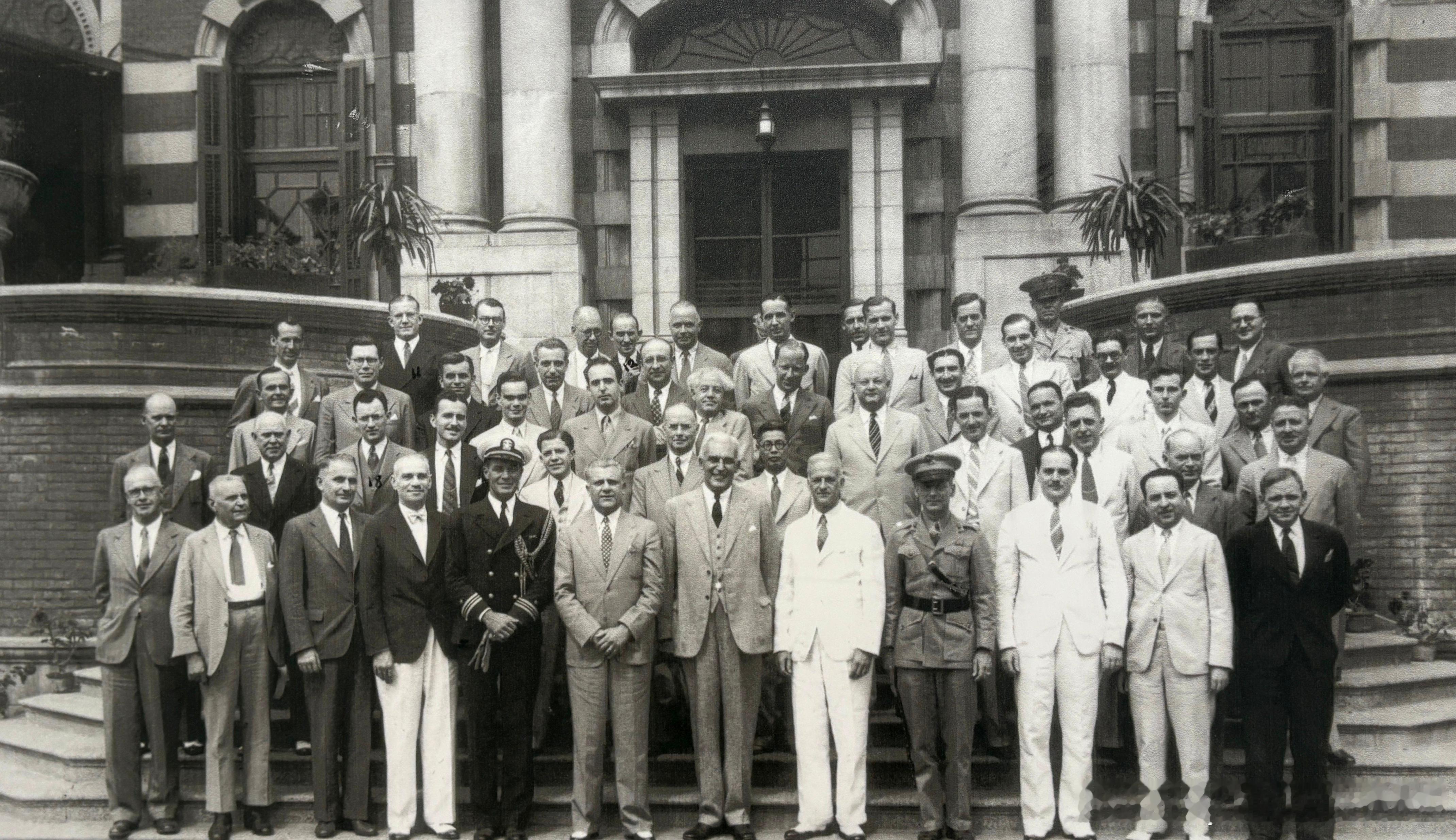 1939年5月28日美孚石油公司菲律宾高级专员访问天津和公司职员在办公楼前合影,三排右三审计员Richard Vernon Hill希尔(1908.10.2-1992.9.5)。希尔1944年派往中国组织秘密逃生网,营救敌后被击落的盟军飞行员,8个月中营救了46名飞行员历史影像