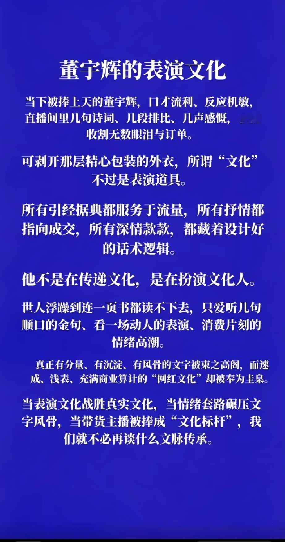 董宇辉被文化光环掩盖了的身份! 这个春节假期在媒体上看到不少质疑董宇辉的文章,有说他卖假货的,有说他靠卖弄文化赚流量的,还有的说他嘴皮子利索专骗丈母娘的…… 昨天我又在抖音上看到一则用文字叙述方式对董宇辉文化的质疑,该文不长,可看文后的截图。 实话实说,我没有在宇辉同行直播间买过任何东西。董宇辉,从我知道这个名字那一天,给我的认知,他就是一个直播带货的,他的爆火,也是因为他用了和其他直播带货者不一样的话术,用独辟蹊径的方式,引发了大量网民对他卖货时展现的语言艺术产生了共鸣甚至是崇拜。这不就是董宇辉的聪明之所在吗,这不比那些声嘶力竭地吆喝或者以丑、低俗表演来吸引流量的带货者,要好很多吗? 质疑或者说指责董宇辉的,根本就没有弄明白董宇辉究竟是干什么的,忽略了董宇辉的行为实质。董宇辉的爆火,就是因为他在东方甄选直播间卖货时,以深厚的语言功力,让公众看到了一个与众不同的直播带货者,而正是这个不同,在人们购买货品时,更能听到董宇辉的金句叠出,更能体验到他带给公众的文化知识的传播。 而董宇辉离开东方甄选创立宇辉同行的初衷,不就是为了有自己更好的卖货平台吗。从宇辉同行创立到现在,平台年带货金额已经突破二百多亿元。 董宇辉就是一个卖货的,只不过他比其他直播卖货者更加聪明,那些指责董宇辉卖弄文化的,实际上是混淆了董宇辉的身份特性,他是一个商人而并不是一个纯粹的文化人,商人追逐利润才是他的目的,不要把商人和文化人混为一谈。