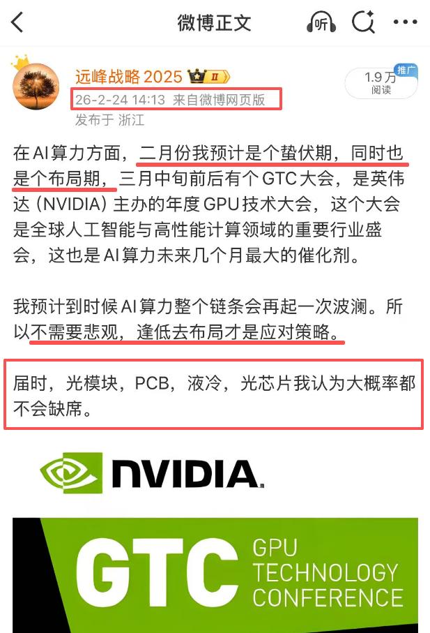 早上的大盘属于良性盘整,这个位置震荡非常正常,今天的科技股表现非常棒,各种元器件,CPO,尤其是北美达子链翩翩起舞。前天我刚刚说过,二月份是AI算力链条不应该绝望,而是布局的时机,三月中旬前后有个GTC大会是个非常大的催化剂。 话音未落,AI算力链条昨天,今天皆是一飞冲天。看来主力比我还着急。