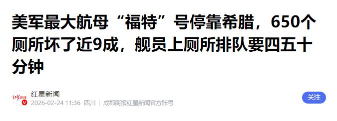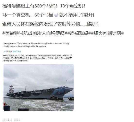 这次福特号厕所被堵,污水横流的原因基本可以确定是福特号超期部署导致的,轻一点说就是水兵发泄不满情绪,重一点直接可以定性为哗变了! 2月23日,美军最大航母“福特”号抵达希腊克里特岛苏达湾,并在当地紧急停靠,原因是粪便处理系统“爆炸”了。据同期社交媒体上发布的视频显示,因真空集便系统失效,舰上大量厕所故障,污水横流,臭气熏天,视频还显示有水兵在能没过小腿的污水里行走,拿着拖把与畚斗在试图清理。有媒体称,舰上650个厕所坏了近9成,舰员上个厕所动辄要排队四五十分钟。 因为真空集便系统彻底停摆,舰上很多厕所都没法使用,污水顺着管道到处流,把船舱的走廊和各个角落都泡透了,刺鼻的臭味填满了航母内部,就算开着通风系统也散不去。 视频里能看到,几名水兵穿着湿乎乎的鞋袜,在没过小腿的污水里慢慢挪动,手里拿着拖把和畚斗,有一搭没一搭地清理着漫出来的污水。他们脸上看不到一点军人该有的精神头,只有藏不住的麻木和疲惫,那种打心底里的无奈,不用近距离接触也能清楚感受到。 权威媒体很快披露了更详细的情况,这艘载着4600多名水兵的超级航母,原本装了650个厕所,这次出故障的差不多占了九成,算下来全舰能勉强用的厕所还不到70个。 这么悬殊的数量差距,让上厕所这种最基本的生理需求,成了水兵们每天都要犯愁的事。排队动辄就要四五十分钟,再加上厕所周围又脏又臭,时间一长,不满的情绪就像蔓延的污水一样,在舰员中间慢慢扩散、积累,最后才酿成了这场惊动全球的丑闻。 一开始不少人都觉得,这就是一次偶然的设备故障,毕竟福特号从服役开始,就经常爆出各种系统问题,从电磁弹射到电力系统,几乎没有哪一个核心装备能一直稳定运行。但仔细梳理这件事的来龙去脉就会发现,这场厕所危机绝对不是偶然,根本原因就是福特号的超期部署。 而厕所堵塞、污水横流的乱象,其实就是水兵们发泄不满的直接方式。说得轻一点,这是他们长期压抑后的消极反抗;说得重一点,这种集体性的抵触行为,已经能算是变相的哗变,里面藏着的信号,足够让美军高层重视起来。 福特号这次的部署任务,原本有明确的时间期限,却被美军高层两次强行延长。长时间在海上漂泊,再加上高强度的执勤压力,舰上的水兵们早就不堪重负。有美国媒体引用水兵的爆料,很多人因为超期部署,错过了自己生命里很重要的时刻:有人没赶上见曾祖父最后一面,这辈子都留下了遗憾;有人和年幼的女儿分开快一年,孩子的成长点滴只能靠模糊的视频看一眼,甚至有了退伍的念头;还有人长时间处于联系不上的状态,两三个星期都没法和家人通个话,只能在思念和焦虑里熬日子。 不得不承认,福特号的真空集便系统本身就有先天设计问题。这套系统原本是借鉴商业游轮的设计,初衷是为了节约用水,却没考虑到航母和游轮的使用环境完全不一样。 游轮的管道设计得比较窄,特别容易堵,而且还能定期靠港维护;但航母要长期在远洋部署,高频率的使用会让管道里的钙质快速堆积,再加上系统是连锁设计,只要一个区域的管道堵了或者阀门出问题,整个区域的厕所都会一起没法用,没有任何备用方案,根本扛不住长期部署的需求。 但设备本身的缺陷,只是引发这场危机的引子。真正让故障集中爆发、没法控制的,还是水兵们的消极应对。维修人员排查故障的时候发现,舰上的管道里,除了正常堆积的钙质,还混着T恤衫、一米多长的绳子等各种杂物。这些东西显然不是正常使用中会掉进去的,更像是水兵们故意扔进去,用来发泄心里不满的。 毕竟,当士兵的合理要求被当成耳旁风,长期承受着超出预期的压力,连最基本的生活保障都得不到,消极抵抗就成了他们唯一能选择的方式。 故障爆发之后,舰上的维修团队只能实行19小时轮班制,白天黑夜连轴转,忙着处理污水泄漏和管道堵塞的问题,但效果还是微乎其微。要清理管道里的钙质堆积,得做专业的酸洗作业,一次就要花40万美元,而且必须在港口停靠的时候才能做。 在远洋部署期间,只能用高压清洗做临时处理,根本没法从根上解决问题。更让人无奈的是,这套系统的制造商明确表示,要彻底重新设计这套有严重缺陷的系统,至少需要10年时间。这就意味着,福特号的厕所问题,在未来很长一段2月23日,美军最大航母“福特”号抵达希腊克里特岛苏达湾,并在当地紧急停靠,原因是粪便处理系统“爆炸”了时间里都没法彻底治好。