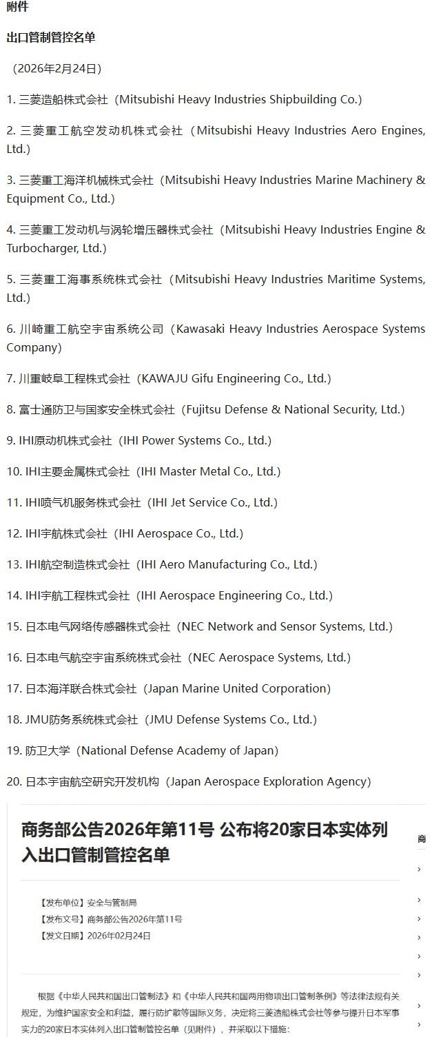 中国商务部扔出了一枚重磅炸弹:直接将三菱重工、川崎重工等20家日本军工企业拉入了出口管制管控名单,同时还有另外20家被列入重点关注名单。没有预热,没有警告,节后开工直接上硬菜,这次对准的不是日本的汽车或马桶盖,而是它正在苏醒的军事野心。 我注意到很多人看到这条新闻,第一反应是“又来了一波反制”。但在我看来,这其实是一次完全不同的操作。因为以前我们更多是“被动接招”,谁制裁我们,我们就反击谁。但这次,中国是在主动划定红线,告诉日本:有些底线,你不能碰。 为什么我敢这么说?大家看名单就能明白。被管制的20家实体,全是三菱重工、川崎重工、IHI这些日本军工界的顶梁柱。它们生产什么?军舰的燃气轮机、战斗机的机身、导弹的制导系统。这不只是贸易问题,这是直接掐住了日本“再军事化”的咽喉。 这里我想用“因为……所以……”的逻辑帮大家捋一下。因为日本这几年动作太大了——防卫预算连续十年增长,2026年直接飙到9万亿日元,还喊着要部署上千公里的远程导弹。所以,中国必须用它们听得懂的方式回应。外交照会人家不疼不痒,但供应链断供,是真的会疼。 我给大家说个细节。日本这些军工企业,有个致命软肋:它们太依赖中国的“工业中间品”了。比如说,三菱重工造军舰燃气轮机需要的耐高温合金叶片,全球能稳定供货的没几家,而中国恰恰是核心供应商之一。再比如说,生产雷达和导弹导引头必需的高纯度稀土,中国占据全球90%的精炼产能。 因为这种依赖是结构性的,所以这次制裁的杀伤力,比很多人想象的要大得多。我查了一些数据,日本本土能替代的产能几乎为零,想找美国买?美国自己的军工产能都喂不饱乌克兰和以色列,价格还贵得离谱。欧洲供应商?受出口管制法规限制,也不敢轻易接单。 这就像什么?就像一个正在盖高楼的人,突然发现砖瓦水泥的供应商全撤了。日本现在的处境就是这样。它们想修一条通往“军事大国”的路,结果刚动工,就被中国拆掉了最关键的一座桥。 有人可能会问,日本会不会硬扛?我觉得扛不住。因为这次中国还留了一手——那20家被列入“关注名单”的企业,比如造直升机的斯巴鲁。它们没有被彻底断供,但出口审核会严到极致。这招特别高明,等于给日本军工界制造了一个“囚徒困境”:谁配合核查,谁就能活;谁继续强硬,谁就先死。 我认为,这才是这次出手的真正深意。中国不是在发泄情绪,而是在用产业链优势,重新定义规则。以前是美国用长臂管辖管别人,现在是中国用供应链反制,告诉对方:想拿我的东西造武器对付我,门都没有。 当然,有人担心这会不会影响中日正常的民间贸易。我的看法是,完全不用担心。商务部说得很清楚,这次只针对“涉及军事用途”的两用物项。丰田、松下、索尼这些民用企业,名单上一个都没有。中国打的是日本的军工野心,而不是普通老百姓的饭碗。 最后我想说,大年初七这一拳,其实是个标志性事件。它意味着中国已经从“被动应对”转向了“主动塑造”。因为手里有完整的工业体系这张王牌,所以我们能打出的牌,比过去任何时候都多。日本如果真的聪明,就该坐下来好好想想:是继续绑在美国的战车上,还是跟邻居把日子过安稳了。
