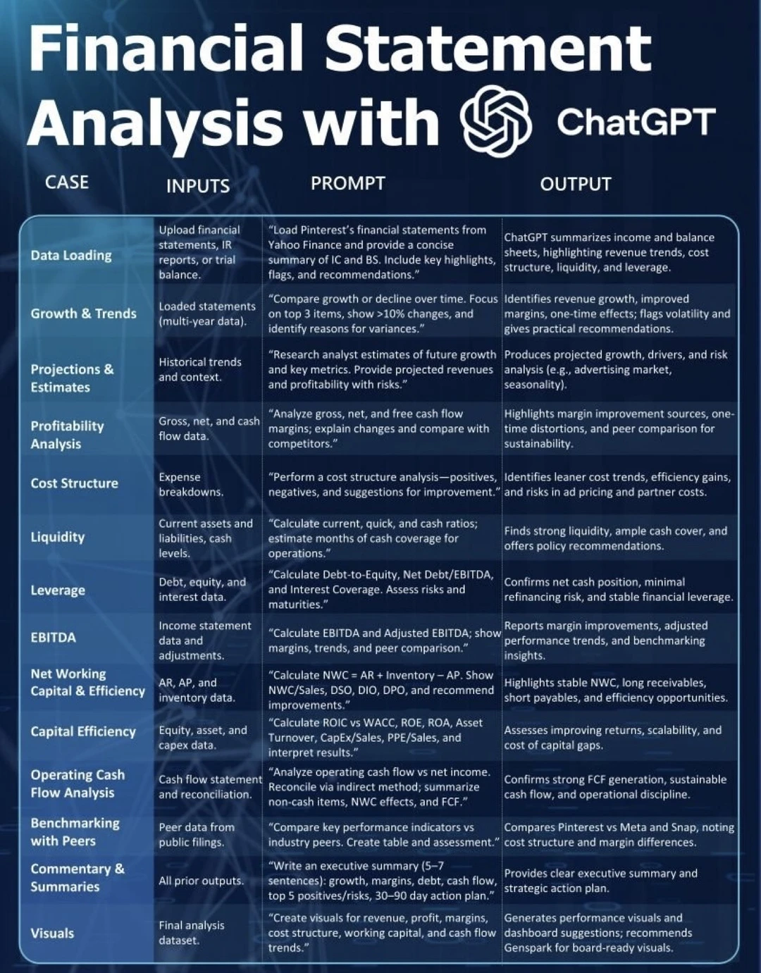 用户只需上传财务报表、投资者关系报告或试算表,ChatGPT就能自动提取利润表和资产负债表的核心信息,并生成清晰总结。它能够识别收入趋势、成本结构、流动性状况和财务杠杆水平,让原本需要数小时完成的分析,在几秒钟内完成。这一步解决了传统财务分析中最耗时的数据整理问题。