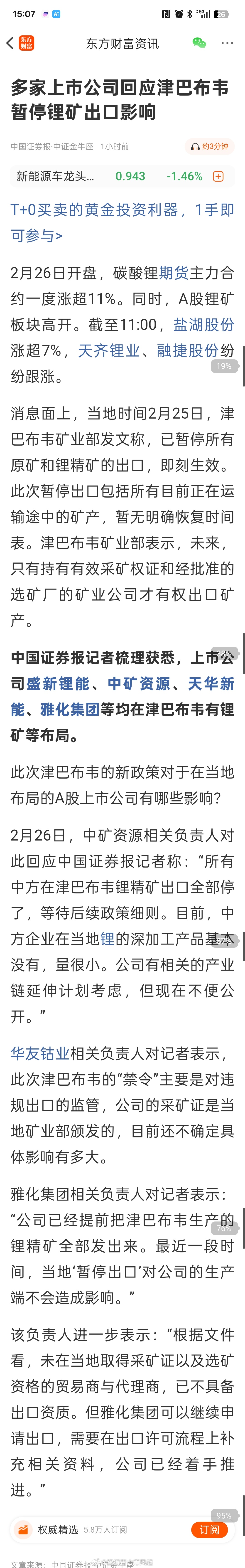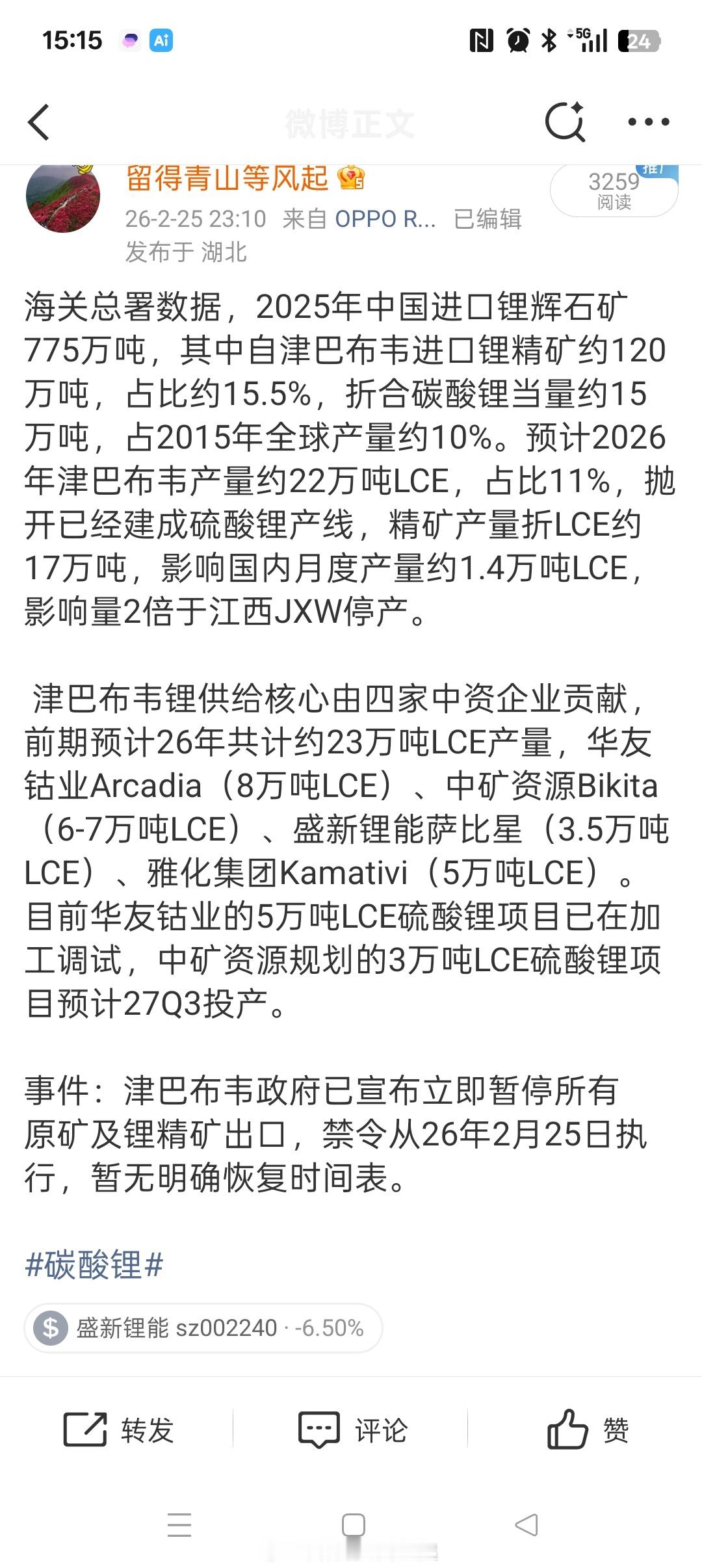津巴布韦暂停锂矿出口,整体还是会影响碳酸锂供应的。