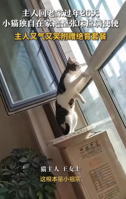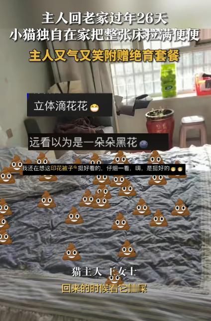 新疆和田,一女子将猫留在家中守屋,独自一人回老家过年26天。起初女子返程归来的路上,还特别想念守屋的猫咪,结果到家后,看着自己卧室里的床上,被猫咪拉满了便便后,瞬间被气笑了! 春节假期里,不少独自在外打拼的铲屎官都会面临一个纠结的难题:回老家过年没法带宠物,到底该把毛孩子托付给谁? 新疆和田一位独居的女生,就做出了让自己事后又悔又笑的选择 —— 让家里的猫咪独自留守看家,这一留,就是整整 26 天。 谁也没料到,这场看似准备周全的宠物留守计划,最后会以一个极度离谱又搞笑的场面收尾。 出发前的那几天,姑娘几乎把所有精力都花在了给猫咪准备留守物资上。她深知猫咪是天生爱干净的小动物,对排泄环境格外挑剔。 特意翻出家里三个最大号的开放式猫砂盆,均匀摆放在客厅和猫咪常待的角落,每一个都铺上足足五厘米厚的豆腐猫砂,这是猫咪平日里最习惯的材质。 猫粮被分装在三个自动喂食器里,精准设定好每日的出粮量,保证猫咪不会饿肚子,自动饮水机也反复检查过滤芯,灌满干净的清水,还额外放了两碗备用清水在不同位置。 窗户留了一指宽的缝隙保证通风,卧室门也轻轻掩着一条缝,让猫咪能自由进出自己的小天地,她蹲在地上一遍遍抚摸猫咪的脑袋,轻声跟它告别。 猫咪还亲昵地蹭着她的手心,发出软糯的呼噜声,一副乖巧懂事的模样,让她彻底放下心来,拎着行李踏上了回老家的路。 在老家的 26 天里,姑娘的心思大半都飘回了自己的小家,落在那只独自守屋的猫咪身上。每天和家人围坐在一起吃年夜饭、聊家常的时候,她总会下意识地拿出手机,脑补猫咪在家蜷在沙发上睡觉、追着光影玩闹的样子。 刷到社交平台上其他铲屎官分享的留守宠物日常,她都会逐字逐句看完,对照着检查自己给猫咪准备的物资够不够、合不合理,甚至还会对着手机跟猫咪隔空说话,叮嘱它乖乖吃饭、好好睡觉。 返程的那天,她早早收拾好行李,归心似箭,车子一路向着和田的方向行驶,她心里全是打开家门,猫咪冲过来围着她转圈、蹭腿撒娇的温馨画面,越想越觉得暖心,恨不得下一秒就推开家门,把猫咪抱进怀里。 车子终于驶进小区,停稳的那一刻,姑娘几乎是蹦着下车,快步跑上楼,掏出钥匙的手都带着期待。 钥匙转动、房门推开的瞬间,没有预想中的猫咪亲昵迎接,反而一股浓烈又怪异的气味直冲鼻腔,那是一种混合着排泄物的刺鼻味道,让她瞬间皱起了眉头。 她心里咯噔一下,一种不好的预感涌上心头,随手把行李放在门口,循着味道一步步往卧室的方向走。 当她轻轻推开卧室门,眼前的景象让她当场愣在原地,大脑一片空白 —— 平日里铺着干净床单、柔软舒适的大床,此刻已经被猫咪彻底 “改造”。 整张床铺的床单、被罩、枕头上,密密麻麻布满了猫咪的排泄物,几乎没有一处干净的地方,原本温馨的卧室,瞬间变成了让人无从下脚的混乱现场,异味在密闭的空间里愈发浓烈,让人难以忍受。 而制造出这一切的 “小肇事者”,正淡定地蹲在床边的地板上,歪着脑袋看着突然回家的主人,圆溜溜的眼睛里没有丝毫愧疚,反而带着一种理直气壮的无辜,慢悠悠地舔了舔自己的小爪子,仿佛在展示自己精心准备的 “欢迎仪式”。 它没有因为主人的归来表现出兴奋,反而一副悠然自得的样子,好像这张被弄得一团糟的床,本就是它应有的领地。 姑娘站在卧室门口,盯着眼前狼藉的床铺,又看了看猫咪一脸无辜的模样,积攒了一路的想念和期待,瞬间被无奈和哭笑不得取代。 她没有发火,也没有责备,只是忍不住扶着额头,又气又笑地叹了口气。 气的是自己精心收拾的卧室被糟蹋得面目全非,整套床品都要彻底更换,后续的清洁整理要耗费大量的时间和精力。 她拿出手机,拍下这让人终身难忘的一幕,镜头里猫咪还淡定地入镜,丝毫没有意识到自己闯了大祸。 收拾完所有混乱,姑娘坐在干净的沙发上,看着身边依旧傲娇的猫咪,冷静下来后决定给猫猫绝育。 经过这次的事情,她明白未绝育的猫咪容易因为情绪焦虑、领地意识出现乱拉乱尿的行为,绝育不仅能减少这类行为,还能让猫咪的身体更健康,避免很多生殖系统的疾病。 她立刻拿出手机,当场给猫咪定下了专属的绝育套餐,打算用这种温柔又科学的方式,帮猫咪改掉小脾气,也让往后的人宠相处更舒心。 她把这段哭笑不得的经历分享到网上后,立刻引来大批铲屎官的共鸣,评论区全是同款留守宠物的 “名场面”,大家一边调侃猫咪是 “报复型选手”。 一边也提醒其他铲屎官,长时间让宠物独自留守不可取,条件允许的话,尽量安排上门喂养、宠物寄养,既能避免宠物焦虑,也能减少家里被糟蹋的麻烦。 对于这件事,您有什么想说的吗?欢迎评论区留言讨论。 信源:荔枝新闻2026-02-25——《主人回老家过年26天小猫独自在家把整张床拉满便便主人又气又竿附赠绝育套餐》