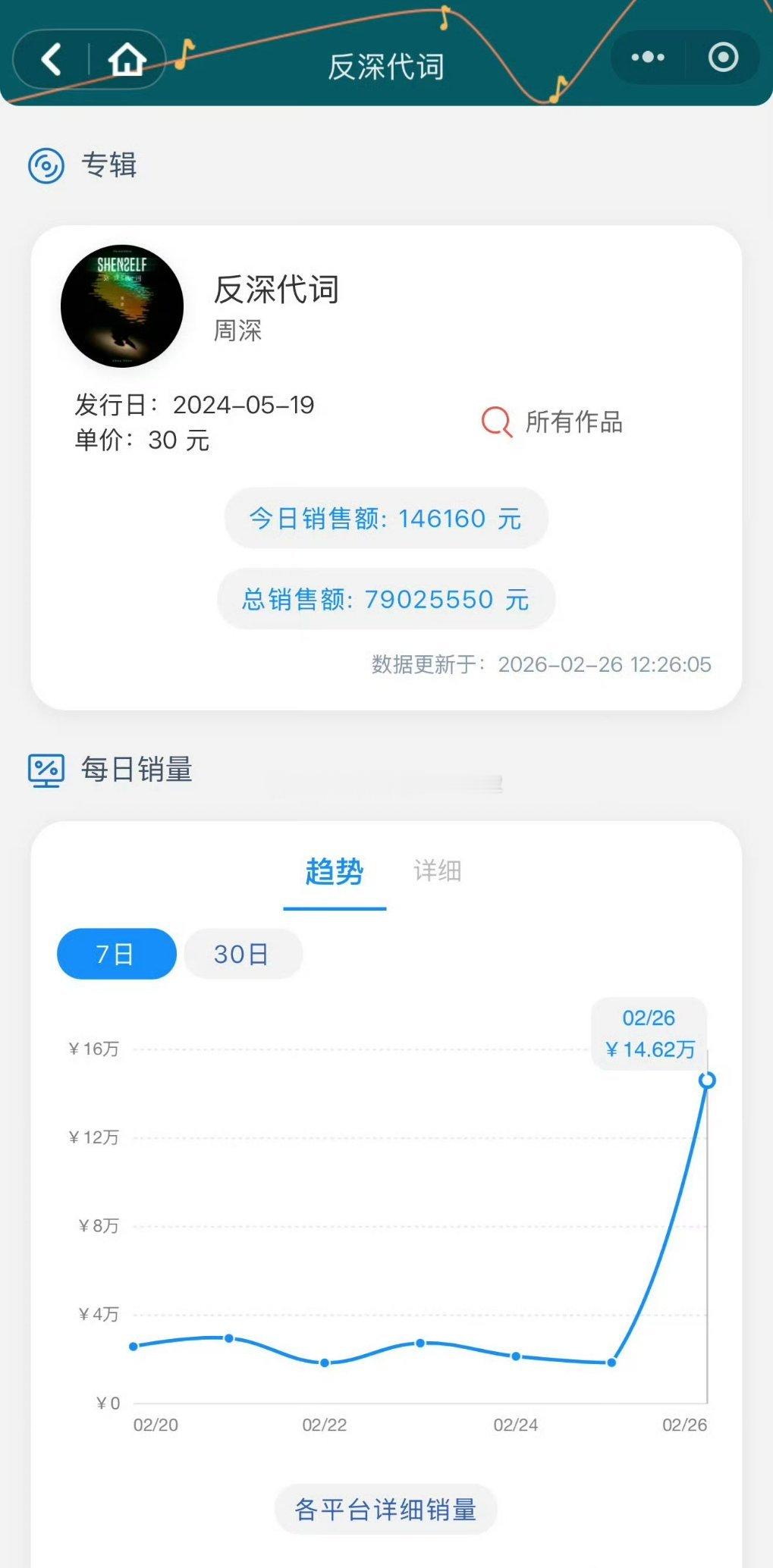 周深专辑《反深代词》总销 售 额来到了7900w,已经是内地专辑xl第一了