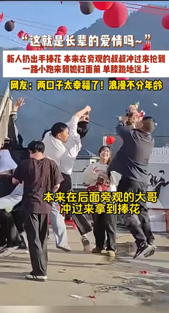 这位大叔上热搜了!2月25日,云南,“这就是长辈的爱情吗~”新人扔出手捧花,本来在旁观的叔叔冲过来抢到,一路小跑来到媳妇面前,单膝跪地送上,网友:两口子太幸福了!浪漫不分年龄。 婚礼现场,阳光正好,红色的气球在风里晃得人心里发暖。手捧花一抛出来,一群年轻人都蹦着去抢,谁也没注意到人群后面的叔叔,他几乎是条件反射一样冲了出去,动作比小伙子们还利落。 他一把攥住那束花,连灰都没来得及拍,就攥着花一路小跑,朝着不远处正在帮着收拾喜宴的媳妇跑过去。阿姨当时还系着围裙,手里还拿着刚擦完桌子的抹布,看见他单膝跪在自己面前,整个人都愣了,下意识就往后躲,可眼睛里的笑意根本藏不住,连眼角的皱纹都跟着软了下来。 这一幕被人拍下来传到网上,瞬间就戳中了好多人。有人说,这才是爱情最真实的样子,不是年轻时的轰轰烈烈,而是走过半辈子,还愿意把旁人眼里的“仪式感”,认认真真地捧到你面前。也有人说,浪漫从来不是年轻人的专利,那些藏在柴米油盐里的惦记,那些在众人面前愿意为你弯腰的瞬间,才是最动人的。 可笑着笑着,又有点感慨。我们总觉得浪漫需要昂贵的礼物、盛大的仪式,却忘了,真正的浪漫,从来都和年龄无关,和金钱无关。它是叔叔冲出去抢花的那股劲,是阿姨嘴上嫌弃眼里却藏不住的温柔,是两个人一起走过那么多年,还能把对方当成手心里的宝。 现在的人好像越来越怕麻烦,觉得婚姻就是搭伙过日子,没必要搞那些虚头巴脑的东西。可恰恰是这些“虚头巴脑”的瞬间,才让日子有了温度。就像这束手捧花,它不是什么名贵的东西,却是叔叔用行动告诉阿姨,这么多年过去了,你依然是我想用心对待的人。 这束被抢来的手捧花,比任何昂贵的珠宝都更有分量。它提醒我们,爱情可以很简单,只要你愿意,随时都可以给身边的人制造一点小浪漫。 各位读者你们怎么看?欢迎在评论区讨论。