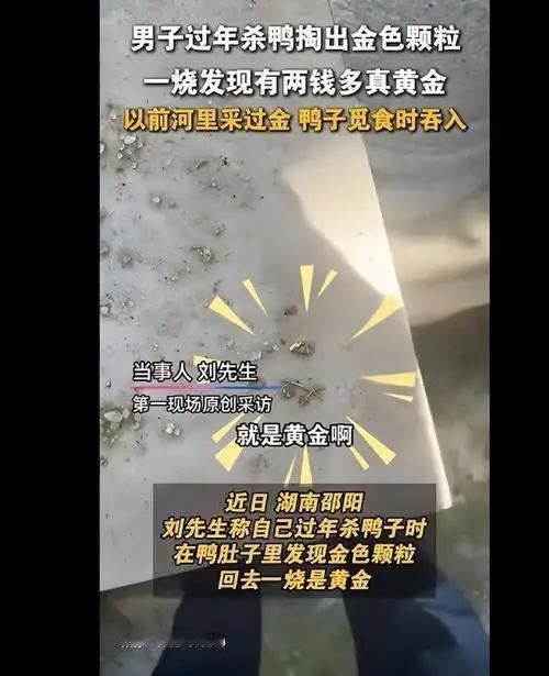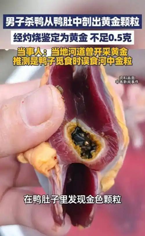 杀鸭惊现“黄金奇遇” 一男子杀鸭时,竟从鸭肚中剖出几颗黄金颗粒,闪耀夺目。这意外收获让他又惊又喜,众人也纷纷称奇。这黄金从何而来?是鸭子误食,还是另有隐情?目前尚无定论,但这一奇事已成邻里间热议的趣谈。