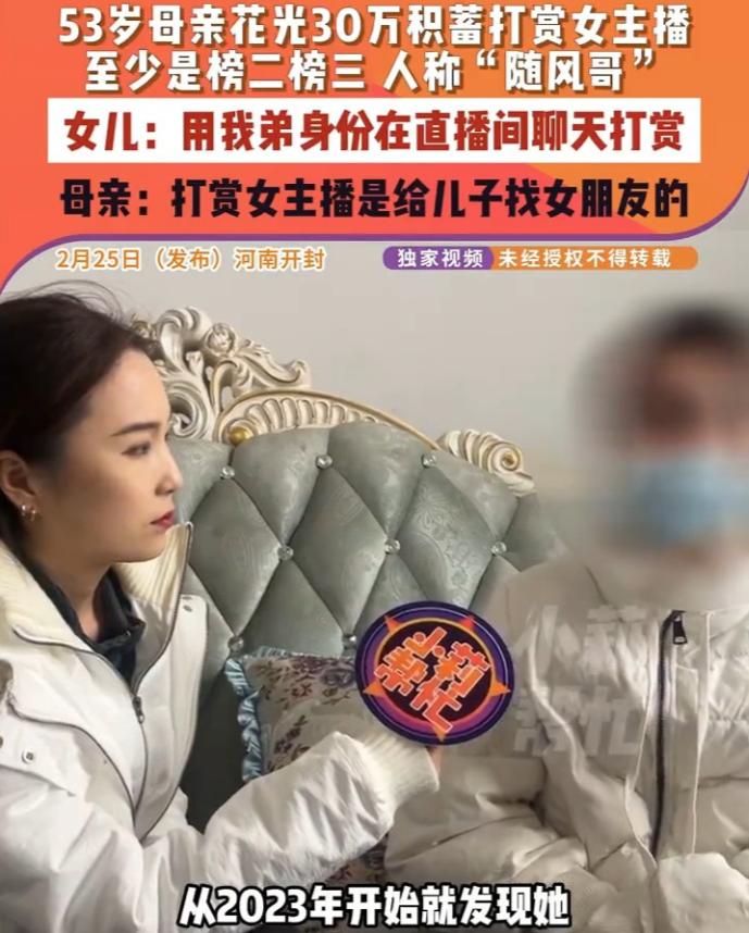 河南开封,女子偶然发现家里的30万的积蓄都没有了,后来一查才知道,是妈妈全都用来打赏给女主播了,但离谱的是,她不是为了自己,而是希望用这种方式给儿子找女朋友,可爸爸一天在工地干活才赚200块,女子也是一言难尽 女子称,妈妈是从23年开始看直播的,开始以为她就是无无聊打发时间,没想到竟然弄出了这么大的动静,发现家里积蓄都没了,她就找妈妈理论此事 她妈说,我这是给你弟弟找对象呢。那些女主播说了,刷够了榜就来找我儿子。我还把儿子照片发给人家了,人家都说有时间来找他玩。我不刷,人家不搭理我啊 她妈还给自己起了个网名叫随风哥,用儿子的名义跟女主播聊天 她爸呢,一天在工地累死累活挣两百块。她妈把家里的金项链都卖了,就为了给直播间那些喊她哥的人刷礼物 有网友调侃说:想不到大妈老了老了还有这样的高光时刻 要说这位妈妈傻吗?她不是傻。她是急 儿子到了娶媳妇的年纪,家里条件一般,当妈的心里急得跟什么似的。她不会用那些正经的相亲软件,不知道去哪儿给儿子介绍对象。刷直播的时候看见那些姑娘,长得好看,说话好听,还会在屏幕上喊谢谢随风哥的礼物 这事说到底,就是个当妈的太想给儿子娶媳妇,想得钻了牛角尖 她知道刷礼物换不来真媳妇吗?应该知道。可她不愿意信。因为不信,就还有盼头。信了,就啥盼头都没了 可怜天下父母心,可怜到这份上,也是没谁了 女子打赏女主播30万称为给儿子找对象