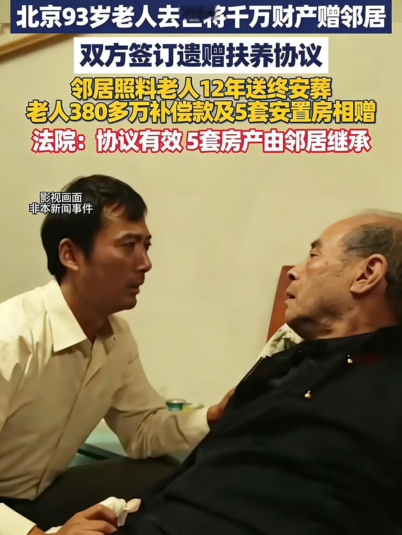 真的太解气了!北京一位93岁无儿无女的大爷,晚年生活不便,身边的亲人常年不露面,全靠邻居细心照顾了整整十二年。后来老人房子拆迁,家产价值千万,那些平时不管不问的亲戚立刻跑来抢财产,就想白占便宜。 最后法院判决,遗赠扶养协议合法有效,所有财产都归一直照顾老人的邻居。血缘再近,不如真心陪伴;只想要好处不愿尽责任,最后自然什么也得不到。这样的判决,难道不正是最公正的结果吗? 人间正能量 远亲不如近邻 真实故事情感感悟