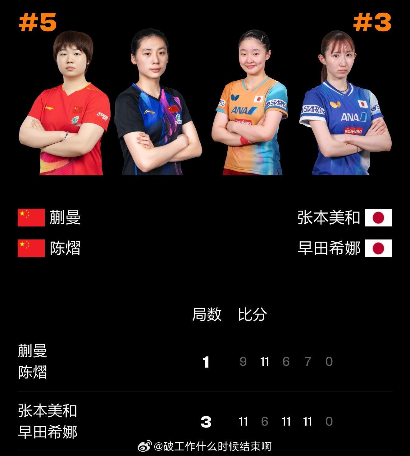 🏓蒯曼/陈熠1-3(9-11、11-6、6-11、7-11)张本美和/早田希娜