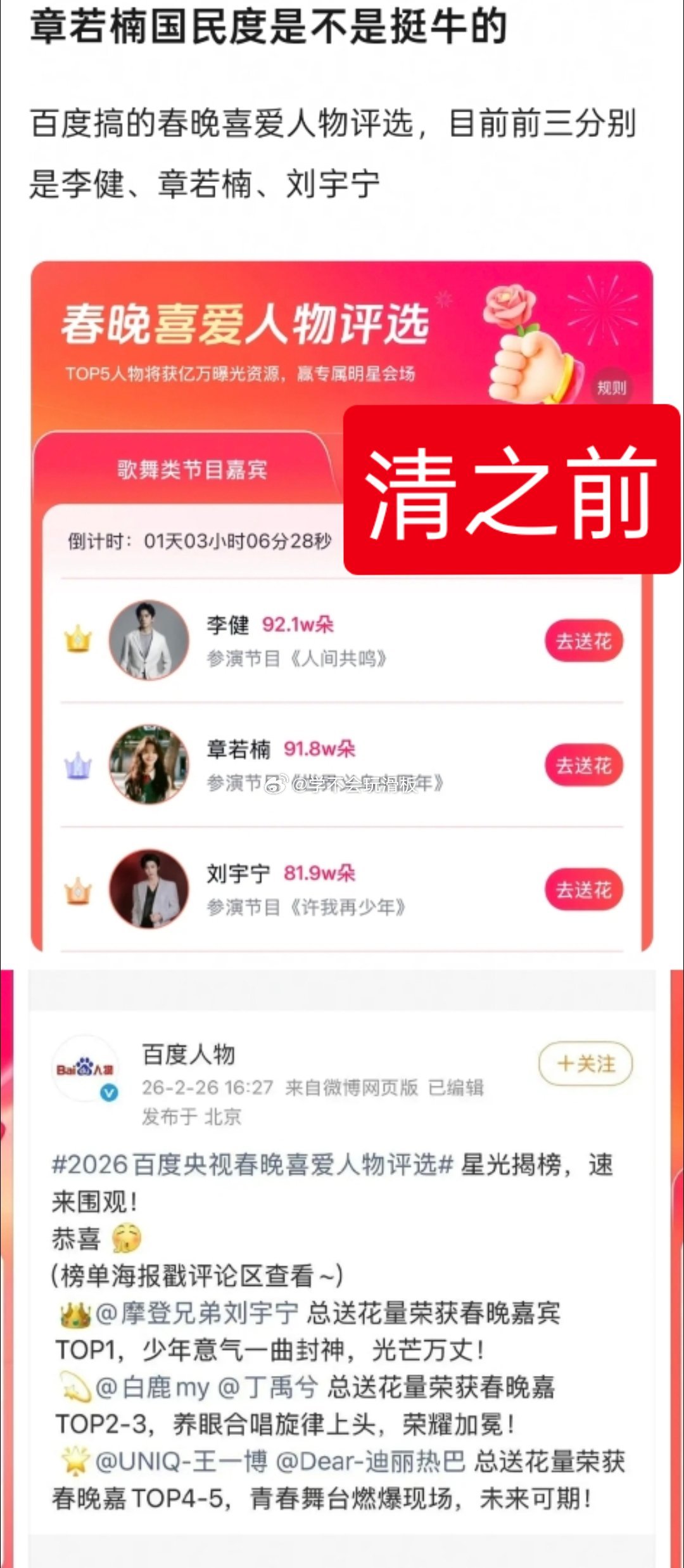 好尴尬,百度举办的春晚喜爱人物评选,在之前是:李健、章若楠、刘宇宁。