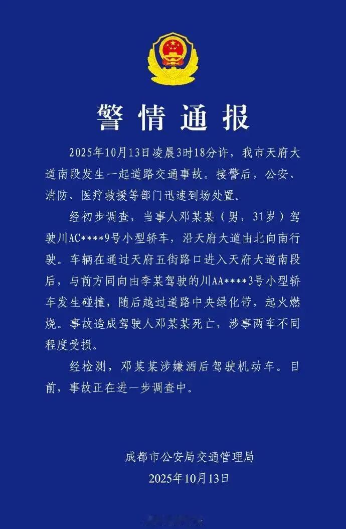 2025年10月13日,成都公安发布的警情通报显示,当日凌晨3时许,成都天府大道南段发生一起道路交通事故,当事人邓某某(男,31岁)驾驶小型轿车,行驶过程中与前方同向由李某驾驶的小型轿车发生碰撞,随后越过道路中央绿化带,起火燃烧;事故造成邓某某死亡,经检测,其涉嫌酒后驾驶。