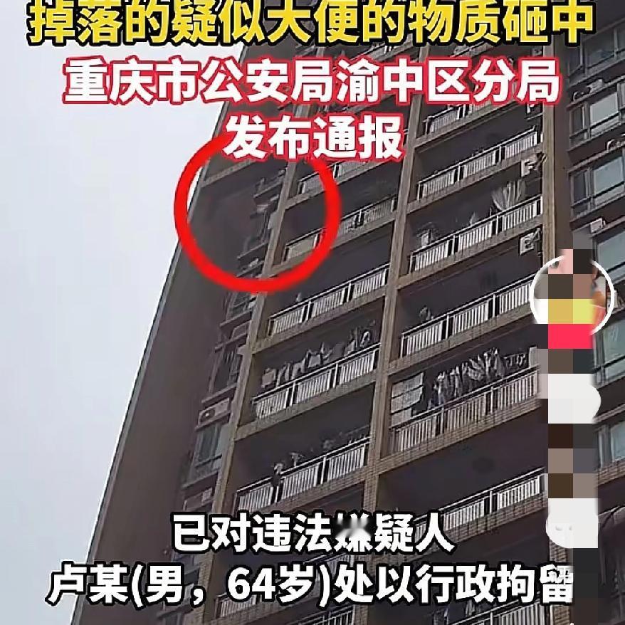 出门旅游, 屎从天降, 谁能想到会遇上这种糟心事? 在重庆渝中区,一名女游客正和家人走在街头。 突然就被从23楼飞下来的污物砸中,那股臭味直接把人熏吐了。 警方通报出来后,大家才知道,干这事的是住在23楼的64岁男子卢某。 他对自己故意抛洒污物的行为供认不讳,目前已被依法拘留。 这事真的让人膈应,高空抛物早就不是小事了。 从之前的菜刀、花盆,到现在的污物,每一次都是对安全的挑衅。 有些人总觉得没人看见就没事,可法律和公德从来都不会缺席。 你怎么看这种高空抛物的行为?如果是你遇上了,会怎么处理?渝中旅行 重庆旅游乱象 重庆扔垃圾 高空扔大便 重庆旅游乱相 洪崖洞旅游乱象