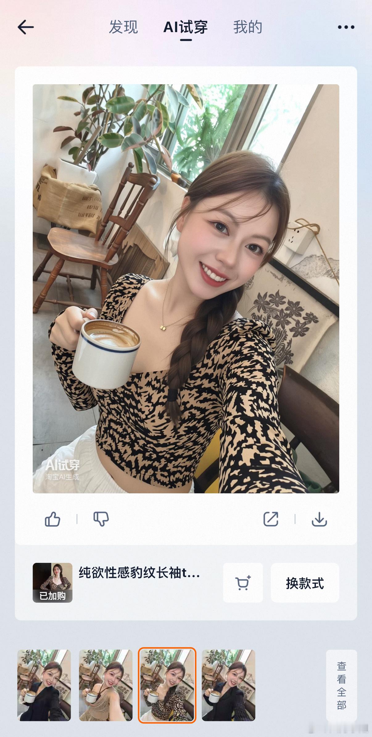 淘宝AI试穿还挺有意思的咧刚买了件跳jazz舞的上衣照片看起来貌似还不错~等到货上身效果如果也一样那岂不是既收获一张美照又收获一件美衣(疯狂脑补中,希望别翻车哈哈哈