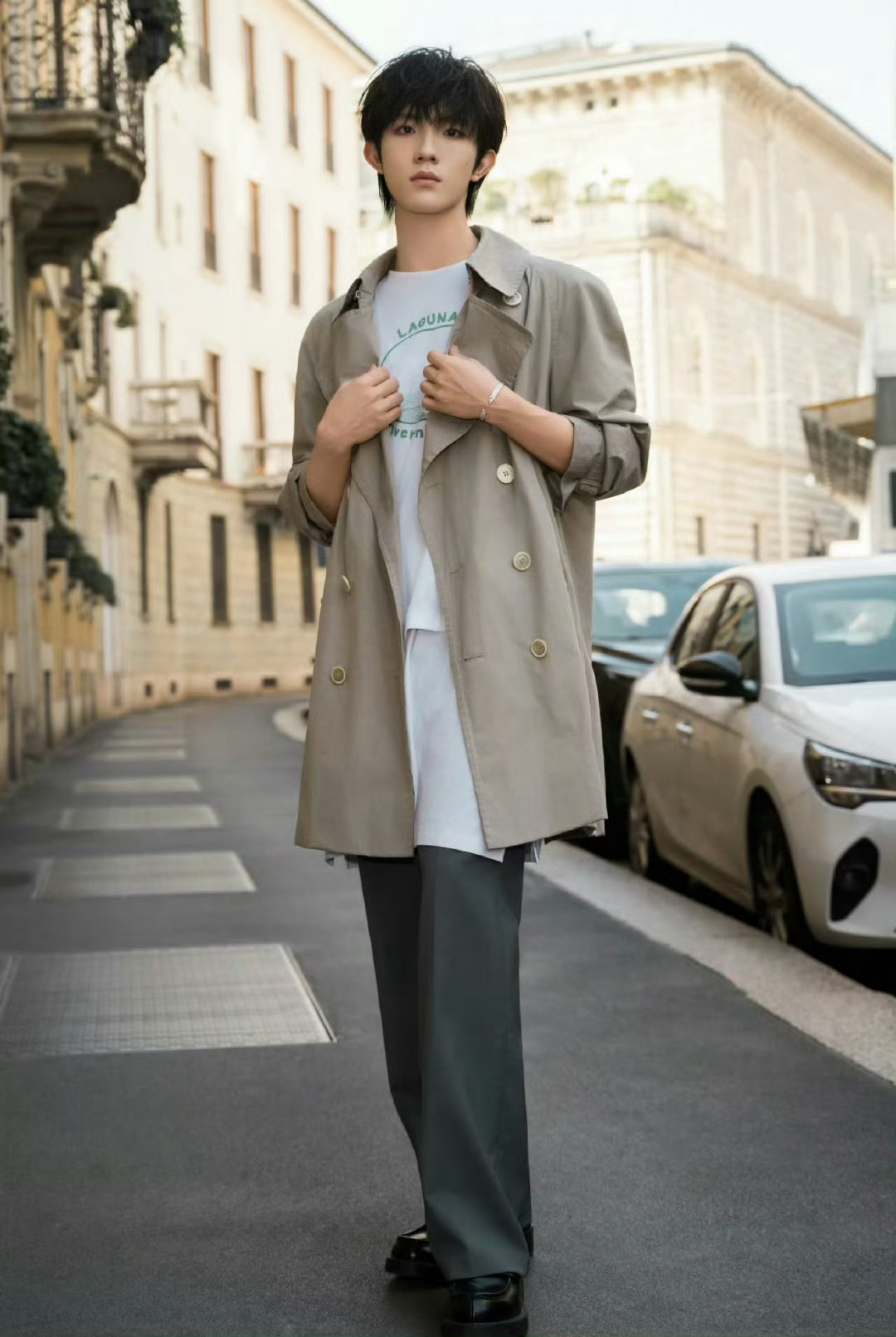苏新皓身穿Prada 2026春夏系列搭配Prada 量身定制款精品珠宝Eternal Gold系列白金密镶钻石手镯亮相米兰时装周米兰时装周