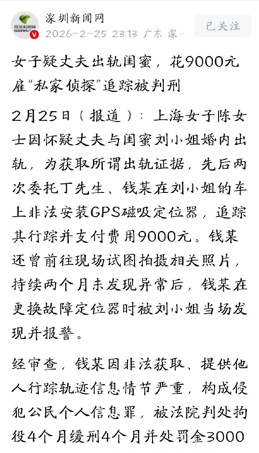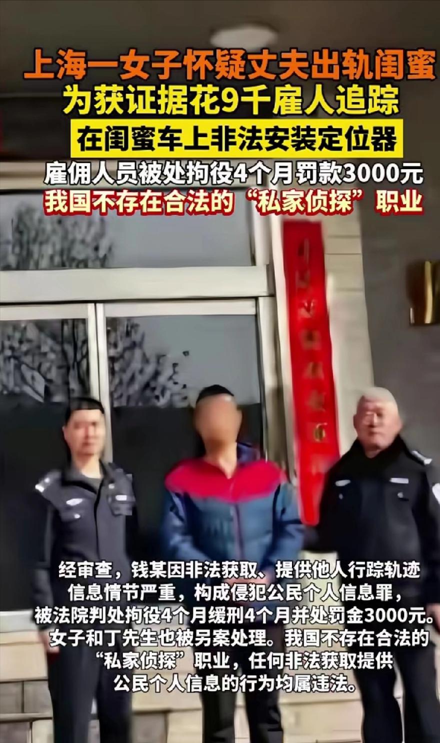 上海,女子怀疑,丈夫和自己的闺蜜有一腿,为了拿到实锤证据,她花了9千多块钱,雇了一个私家侦探,在闺蜜车上装了定位器,随时追踪。但几个月下来,一点有用的东西都没拍到不说,定位器还突然坏了。侦探冒险爬入车底更换,谁知,被闺蜜逮个正着。这下,抓人被抓着,把自己送进去了。 这件发生在上海的真实案例,看似是一场狗血的家庭情感闹剧,实则戳中了当下很多人在情感矛盾里容易忽视的法律与理智底线,也给所有被猜忌冲昏头脑的人敲响了警钟。 这名女子的出发点,无非是对婚姻的不安,看着丈夫频繁晚归、和闺蜜相处融洽,心里的猜忌慢慢生根发芽,原本可以坐下来沟通的问题,却被她一步步引向了极端的方向。 她没有选择坦诚交流,也没有理性梳理彼此的关系,反而轻信了所谓私家侦探的“神通”,心甘情愿掏出近万元费用,用非法的方式去窥探他人隐私。 在闺蜜的车上偷偷安装定位器,全天候追踪对方的行踪,在她看来这是寻找真相的捷径,可从法律和道德层面来说,这早已越过了合理的边界。 长达数月的监控,没有拍到任何所谓的不当行为,反而清晰勾勒出闺蜜正常的生活轨迹,这也印证了女子的怀疑不过是自己的主观臆想。 可偏执的情绪一旦占据上风,只会让人越陷越深,即便毫无收获,她依旧不愿收手,直到定位器故障,还指使侦探冒险潜入车库更换,最终当场败露,把自己彻底拖进了违法的泥潭。 很多人会下意识觉得,这名女子是为了守护家庭,算是情感里的弱者,可法律从来不会因为情绪和动机,就无视违法行为的存在。 公民的行踪轨迹属于受严格保护的个人信息,私自非法获取、追踪他人隐私,已经触犯了相关法律,无论是出钱委托的女子,还是动手操作的私家侦探,都要为此承担相应的法律责任。 这场闹剧最终落得全员皆输的下场,近万元的费用打了水漂,曾经亲密的闺蜜关系彻底破裂,原本存在隔阂的婚姻也没能挽回,女子自己还留下了难以抹去的违法记录,得不偿失。 这也让大家看清,在情感关系里,猜忌从来都不是解决问题的方式,非法窥探更是只会自食恶果。 再亲密的关系,也不能成为侵犯他人隐私的理由,遇到矛盾唯有理性沟通、守住法律底线,才是正确的处理方式,否则只会像这名女子一样,本想寻找所谓的真相,最终却亲手毁掉了自己的生活。 大家对此怎么看?欢迎评论区留下您的观点!
