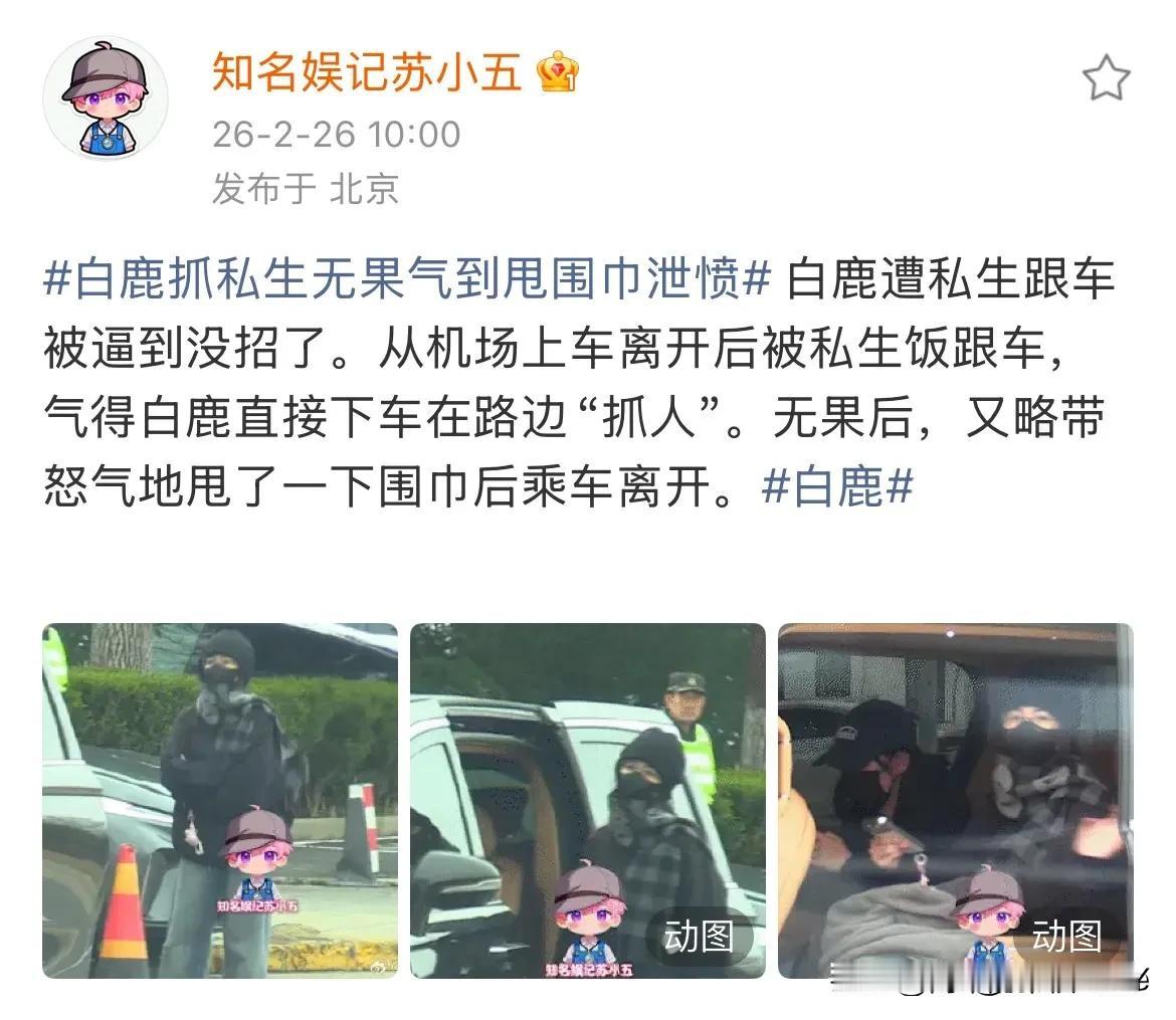 2月26日,白鹿抓私生无果气到甩围巾泄愤,本来准备下车跟私生理论一番的白鹿,在看到毫不畏惧的私生与车内的闺蜜后,选择不与之纠缠,转身上车离开! 白鹿裹得严严实实的外套遮不住眼里的烦躁,那股子憋闷,隔着屏幕都能感觉到。这阵子她的私人行程像被装了追踪器,走哪都有镜头跟着。 更糟的是,跟曾舜晞共事,就被传成了谈恋爱。难道男女同事非得扯上点啥?普通朋友的界限,在流言里咋就这么模糊? 艺人也是人,总得有点自己的空间。买杯咖啡被拍,跟朋友吃顿饭被写得七荤八素,换谁能受得了?私生的镜头像根刺,扎得人浑身不自在;捕风捉影的传言更像苍蝇,嗡嗡叫着甩不开。 有人喊于正多上点心,不说别的,起码得护着艺人的安全。这话在理。舞台上再光鲜,私下里也需要喘口气的地方。连基本的安宁都保证不了,哪还有心思琢磨作品? 其实粉丝追星,追的该是作品里的光亮,不是扒开私生活的窥探。同事间的正常交往,更不该被硬生生套上狗血剧本。白鹿那记甩围巾的动作,哪是泄愤?是想喊一句:能不能让我好好做个普通人? 希望这股子戾气能早点散,让艺人能安心上班,放心交友,不用裹成粽子还怕被拍。毕竟,留住观众的从来不是绯闻,是站在台上时眼里的光。