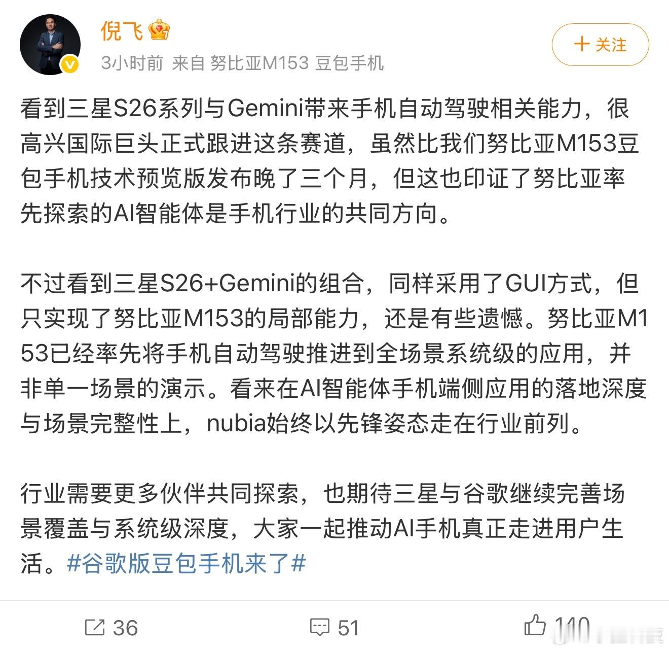 高管称S26只实现豆包手机局部能力不管怎么说,2026年AI手机会有更多玩法。虽然现在行业都在看综合场景运用,覆盖购物、社交、休闲娱乐等更多场景的综合表现。很可能未来手机会脱离现有接打电话、购物、游戏等更多功能,而是成为大家日常生活、工作、旅游的一个工具。目前各大手机厂商都在AI赛道赛跑,谁能笑到最后,谁能抢占更多优势,还不太好说。但可以肯定的是,跟不上大趋势,是很容易被淘汰的。
