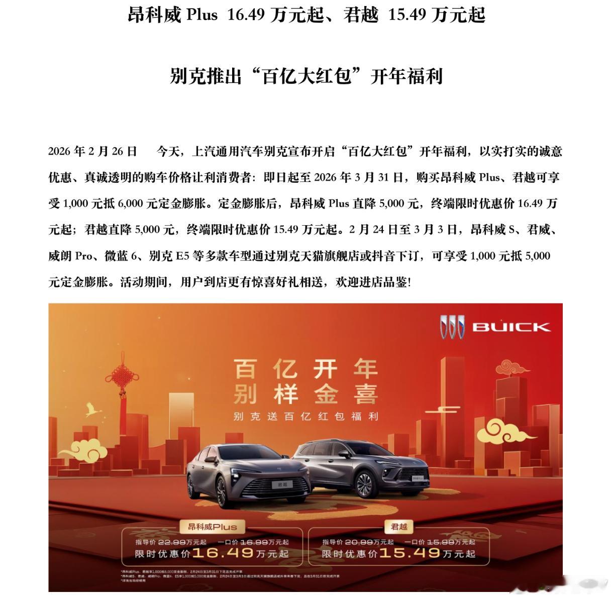 今日,上汽通用汽车别克宣布开启“百亿大红包”,即日起至2026年3月31日,昂科威Plus直降5,000元,终端限时优惠价16.49万元起;君越直降5,000元,终端限时优惠价15.49万元起。2月24日至3月3日,昂科威S、君威、威朗Pro、微蓝6、别克E5等可享受1,000元抵5,000元定金膨胀。