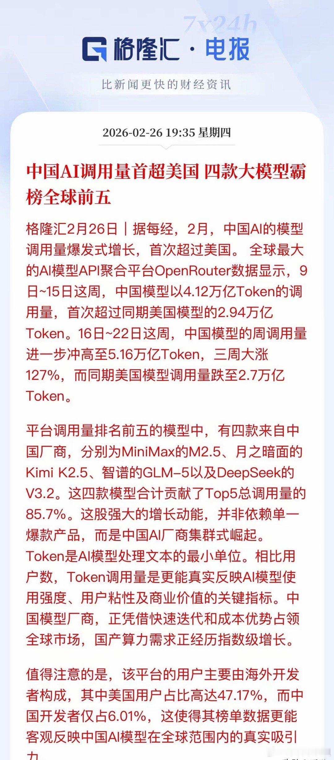 算力产业链迎重磅利好!我国AI调用量首超美国!核心受益个股梳理!今日,AI圈炸出重磅消息:我国AI模型调用量首次超越美国,登顶全球第一!最新数据显示,在全球最大的AI模型聚合平台OpenRouter上,2月第三周,我国模型的调用量飙升至5.16万亿Token,三周暴涨127%,同期美国模型的调用量却跌至2.7万亿Token。这是我国AI发展史上的历史性一刻。更重磅的是,全球调用量前五的模型中,我国厂商狂揽四席!MiniMax、月之暗面Kimi、智谱、DeepSeek集体霸榜,合计贡献了Top5总调用量的85.7%。这不是单一爆款的胜利,而是AI厂商的集群式崛起,凭借快速迭代和成本优势,在全球市场站稳脚跟,这将直接带动国产算力需求进入指数级增长周期。核心受益方向梳理:1.国产算力及芯片Token调用量的指数级增长,意味着算力需求正在经历指数级增长。无论是模型训练还是推理,都需要采购大量的算力芯片和服务器。· AI芯片:寒武纪、海光信息、景嘉微等。· AI服务器:浪潮信息、中科曙光、工业富联、拓维信息、鸿博股份、首都在线等。· 算力基础设施:润泽科技、奥飞数据、数据港、中际旭创、新易盛、天孚通信、光迅科技、沪电股份等。2.生态伙伴与榜单上的MiniMax、月之暗面、智谱、DeepSeek等大模型厂商有深度合作的A股公司,将随着模型调用量激增而受益。·电广传媒:旗下达晨财智早期投资智谱。·凌云光/阿尔特:与智谱合作。·九安医疗:曾公告投资月之暗面。·掌阅科技:与Kimi有数字阅读生态合作。·科大讯飞:星火大模型+生态。·昆仑万维:Opera浏览器与天工大模型。·金山办公:WPS AI深度集成。·万兴科技:AI视频创意软件。·视觉中国:为大模型提供高质量训练数据。这次调用量的反超,不仅是我国AI技术的胜利,更标志着我国科技产业链的全球竞争力迈上新台阶。随着国产大模型在全球市场的渗透率不断提升,算力产业链的黄金期,或许才刚刚开始。