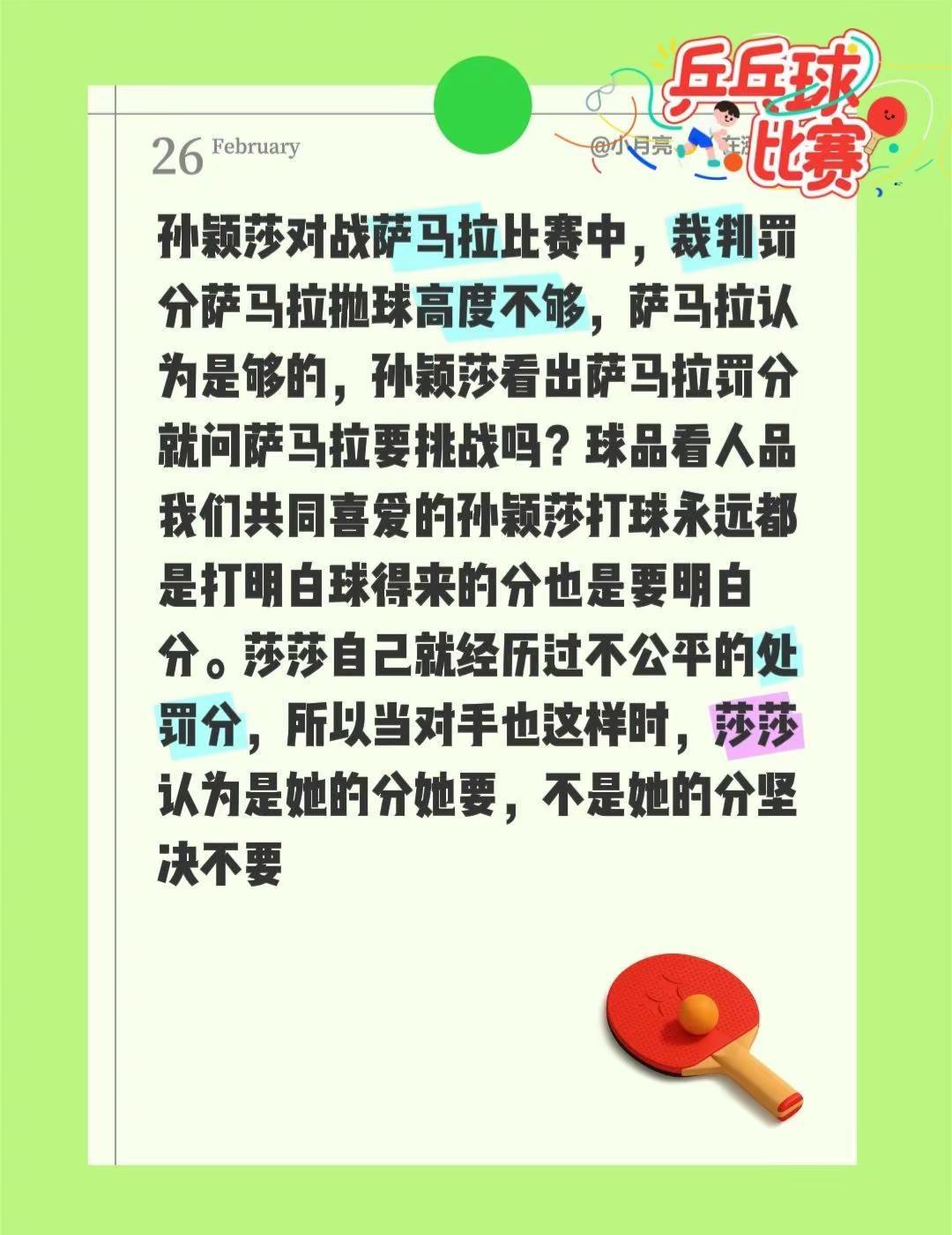 孙颖莎对战萨马拉比赛中,裁判罚分萨马拉抛球高度不够,萨马拉认为是够的,孙颖莎看出萨马拉罚分就问萨马拉要挑战吗?球品看人品我们共同喜爱的孙颖莎打球永远都是打明白球得来的分也是要明白分。莎莎自己就经历过不公平的处罚分,所以当对手也这样时,莎莎认为是她的分她要,不是她的分坚决不要文字投稿激励计划 真实分享官 真实分享传递正能量 孙颖莎对战萨马拉