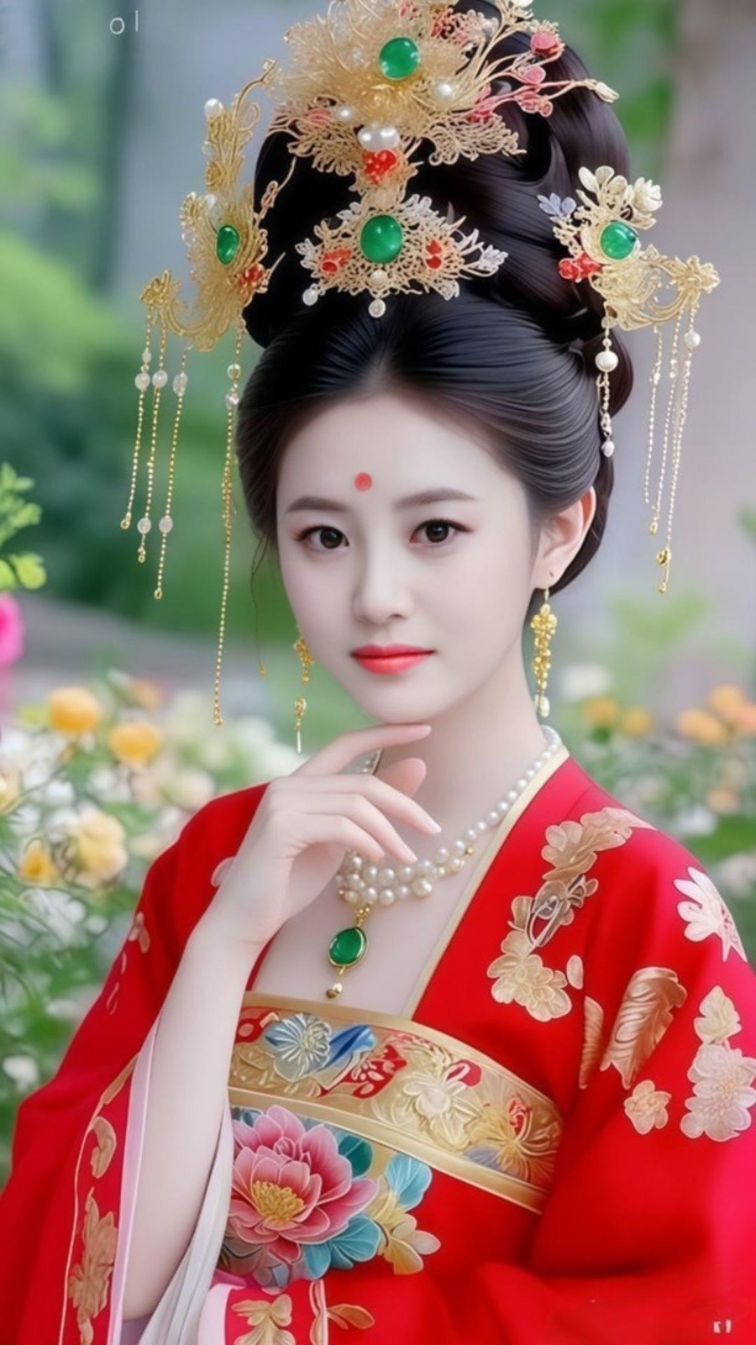 古风美人,红衣华裳,花钿妆点,宛如画中仙。