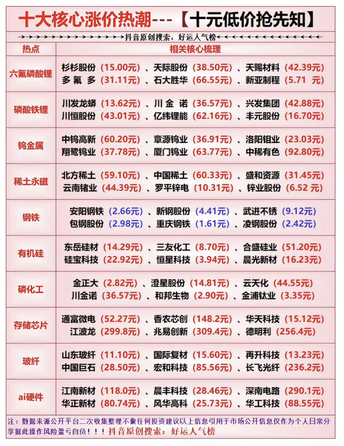 十大核心材料:涨价热潮!10元低价股 1.六氟磷酸锂+磷酸铁锂 2.钨金属+稀土永磁 3.钢铁+有机硅 4.磷化工+存储芯片 5.玻璃玻纤+AI硬件 相关核心龙头股:(值得收藏)