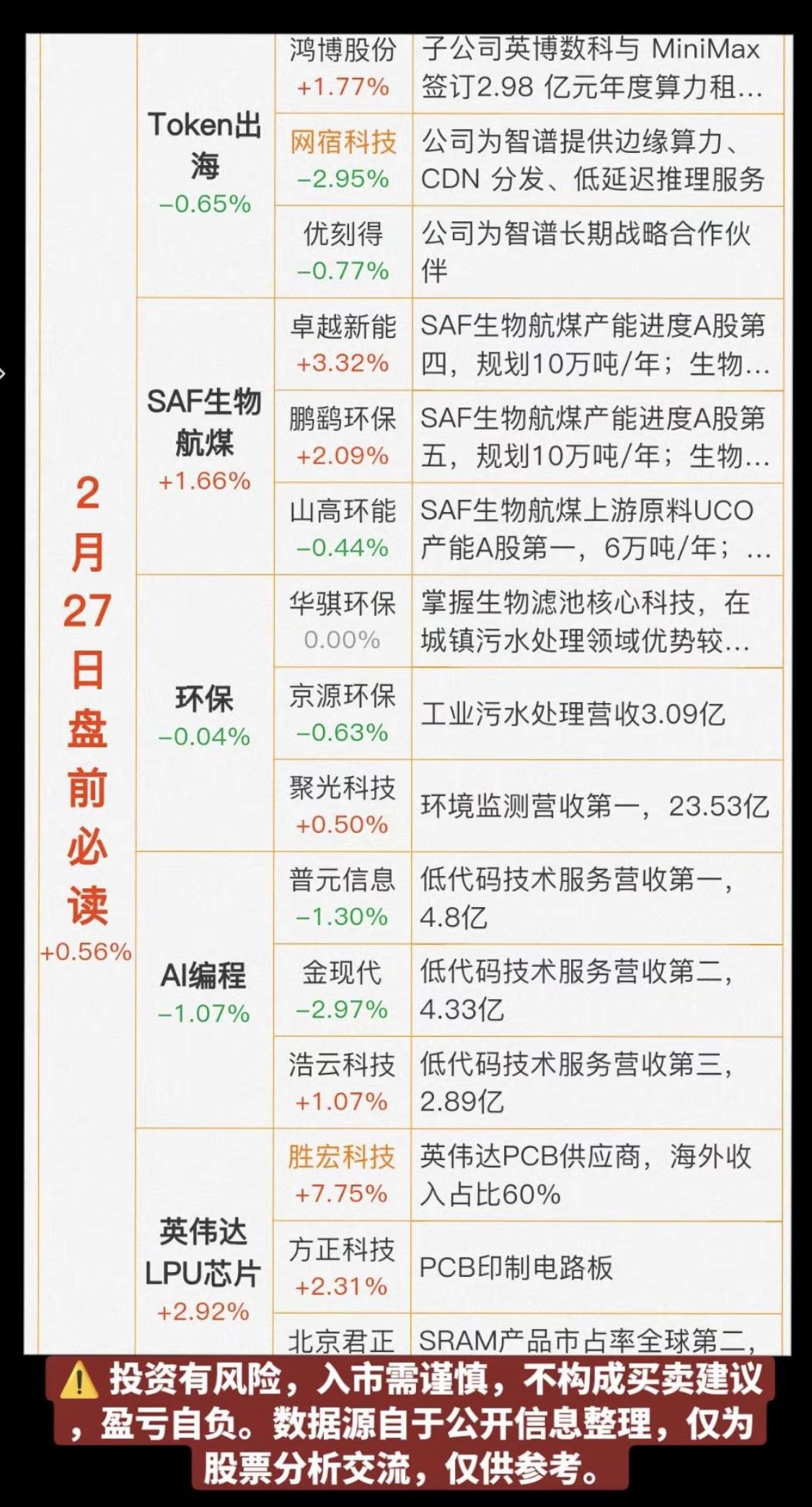2.27周五 盘前 财经热点必读! 1.Token出海,AI应用领域推广 2.SAF生物航煤,用电紧缺 3.两会期间+环保新标准出台 4.人工智能:AI编程 5.英伟达LPU芯片,财报强劲,AI应用