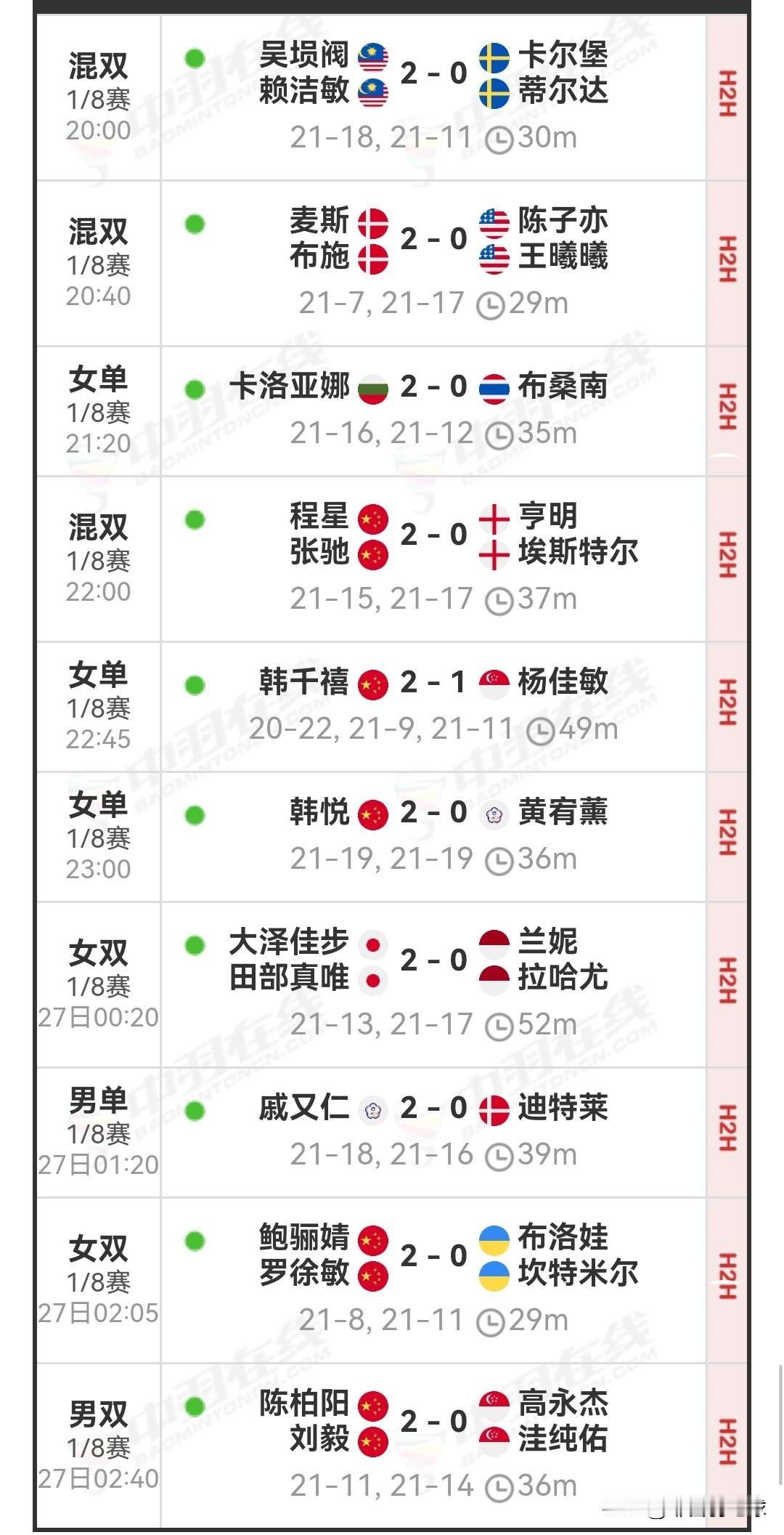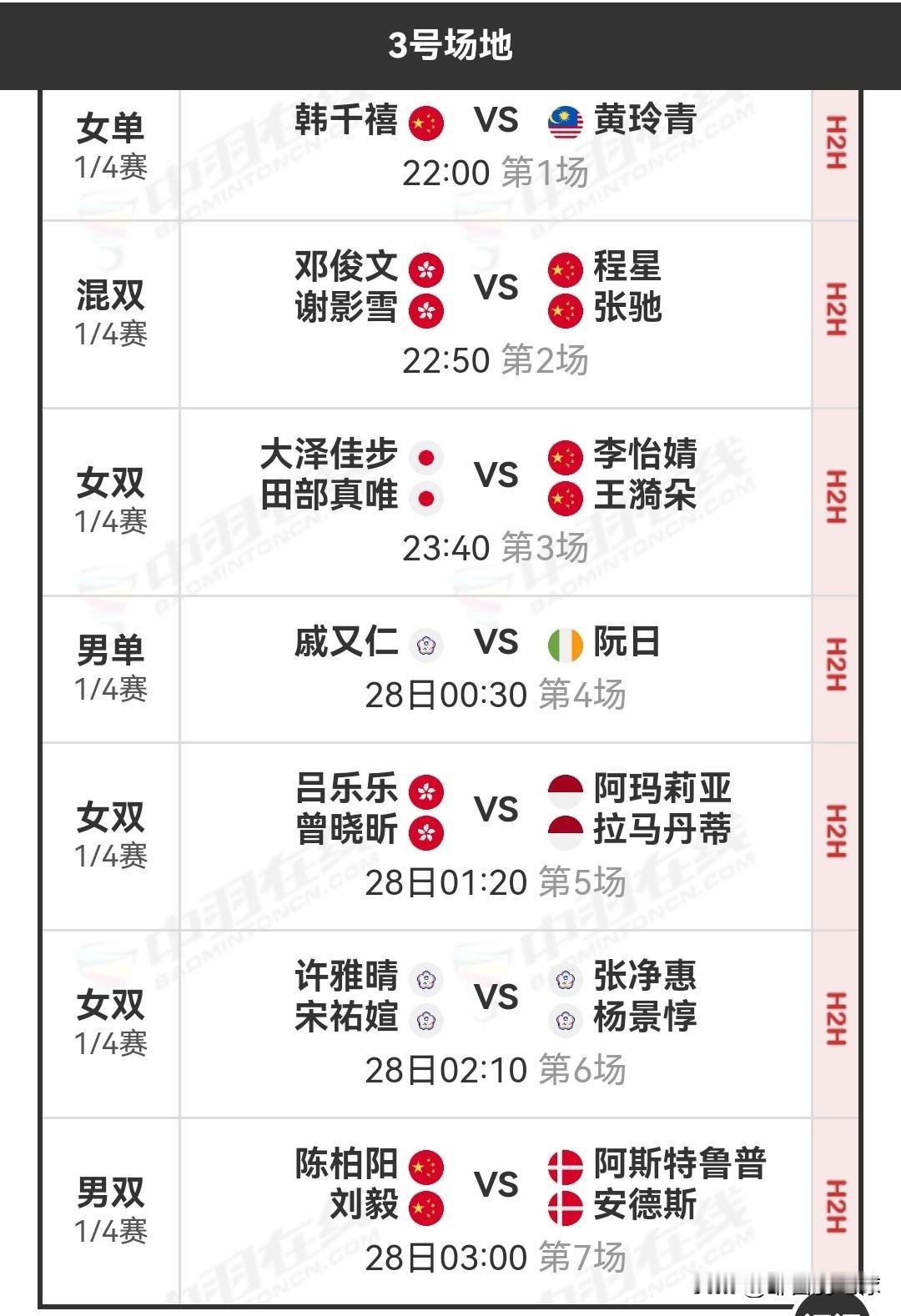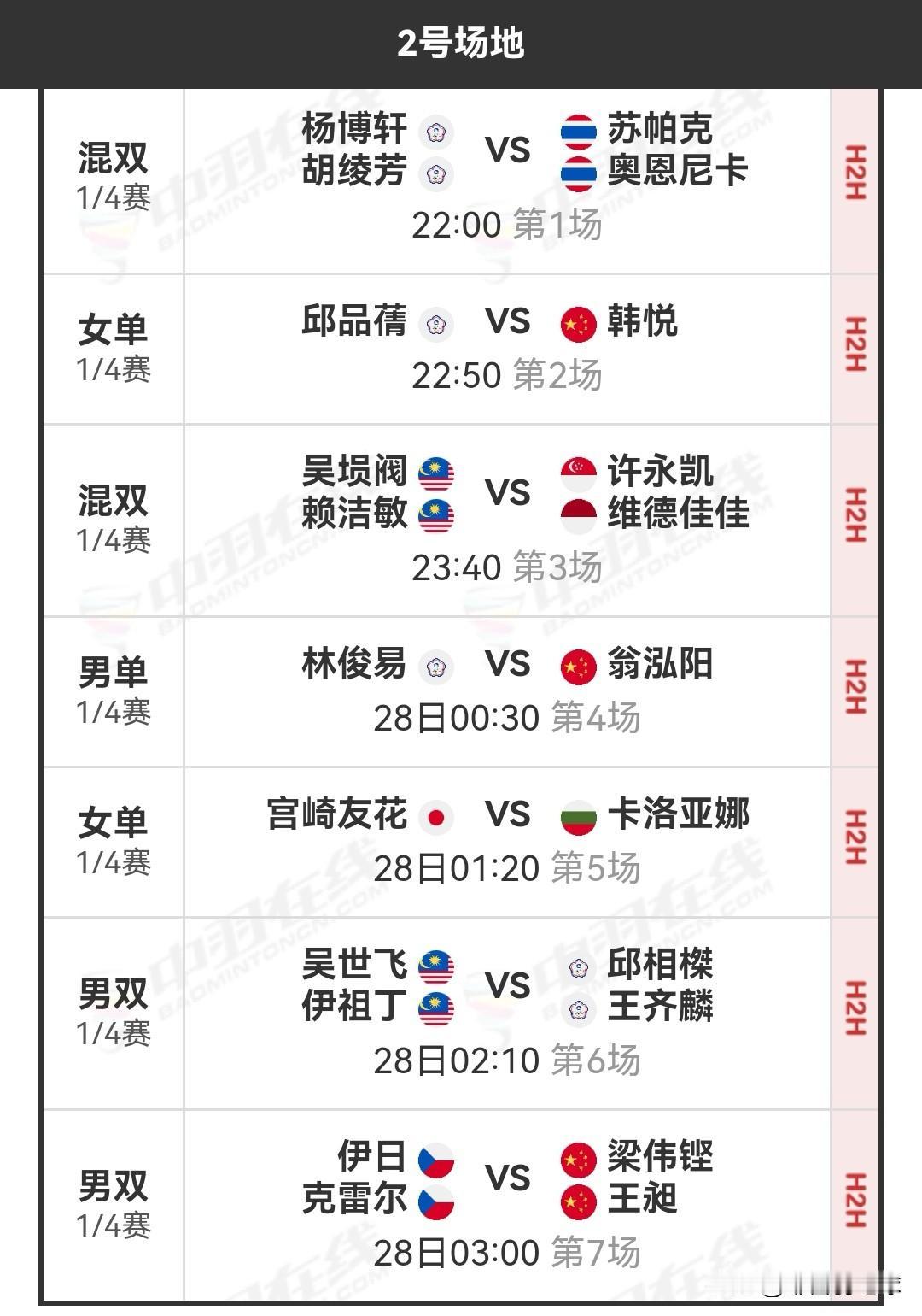 2月27日德国羽毛球公开赛1/4决赛安排 昨日,国羽在比赛中斩获9胜2负的佳绩。梁王组合历经三局苦战,逆转险胜波波夫兄弟;韩千禧同样三局逆转击败杨佳敏。不过,陆光祖连输两局,不敌伍家朗;郭新娃/陈芳卉两局完败于苏格兰选手邓恩/麦克菲森。其余国羽队员皆轻松以两局优势战胜各自对手。 今日北京时间22:00起,1/4决赛正式打响,共有三块场地同时进行比赛。对阵分别为翁泓阳对战林俊易,韩千禧对阵黄玲青,100分组合对阵阿斯特鲁普/安德斯。今日详细对阵安排与昨日详细战报如图所示。 羽毛球 羽毛球爱好者 羽毛球该如何选择 羽毛球比赛 羽毛球赛事 羽毛球赛程 国羽 国羽加油
