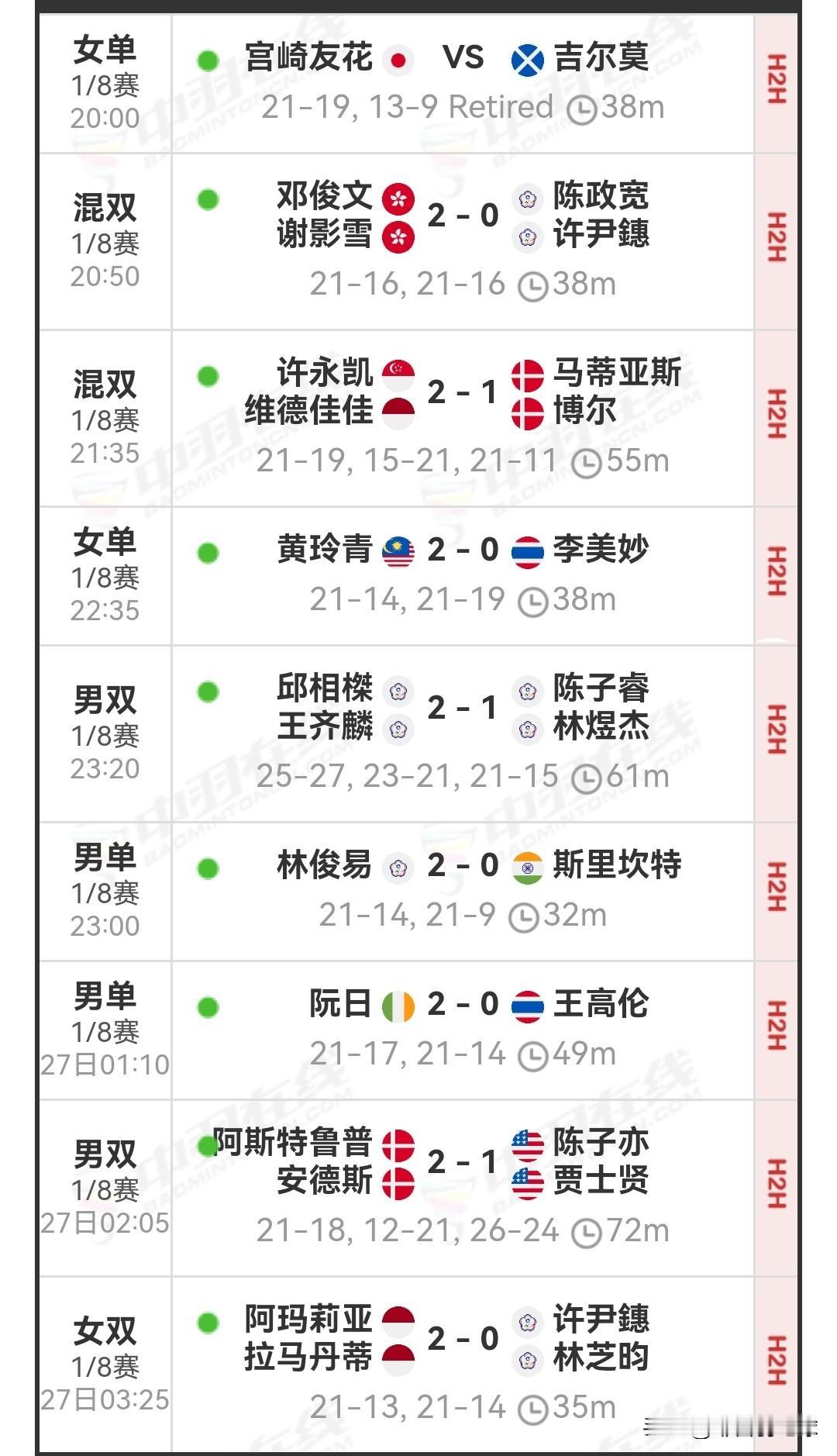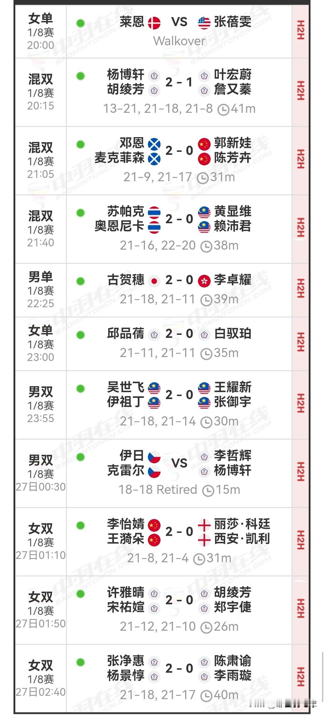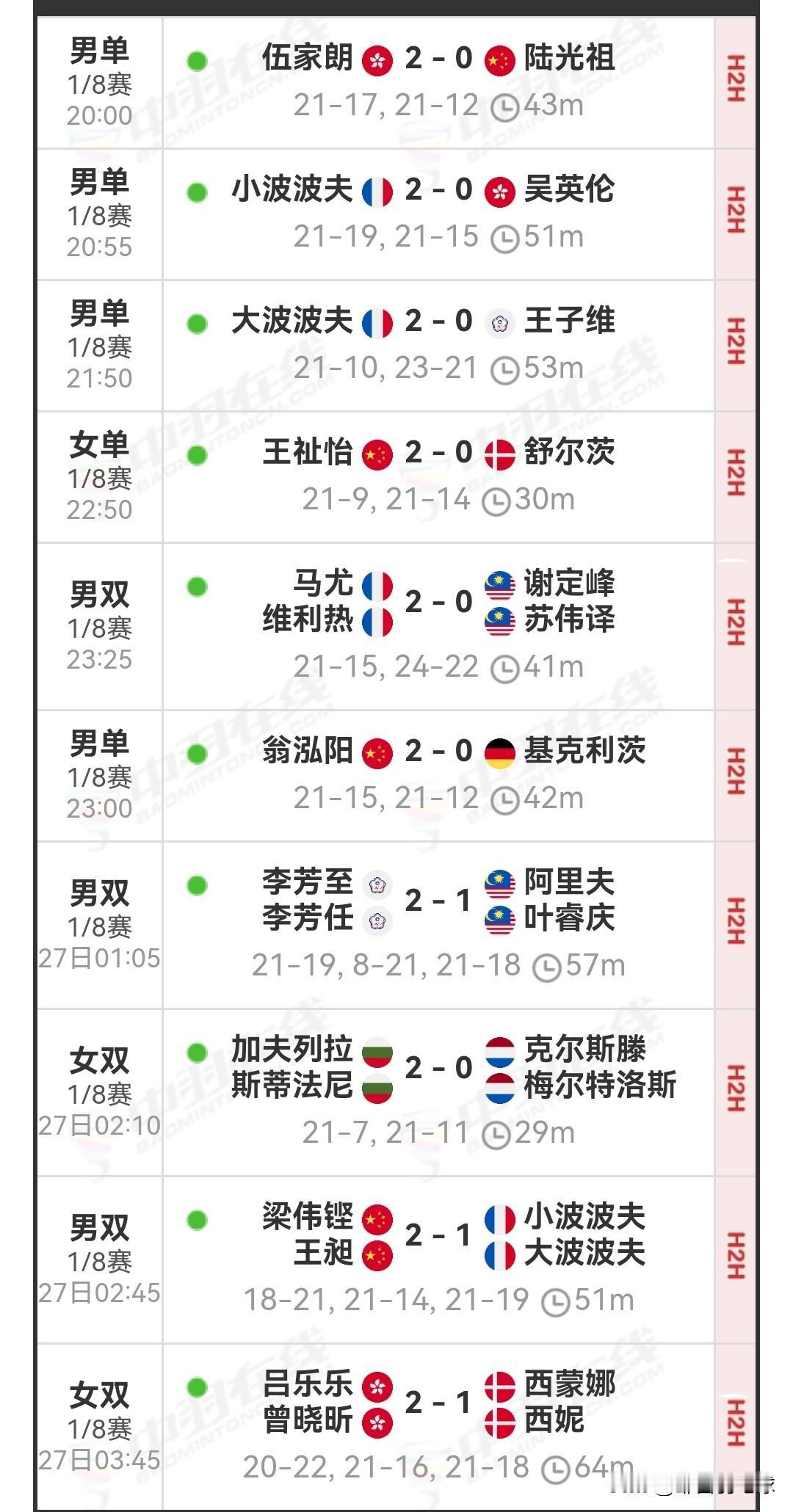 2月27日德国羽毛球公开赛1/4决赛安排 昨日,国羽在比赛中斩获9胜2负的佳绩。梁王组合历经三局苦战,逆转险胜波波夫兄弟;韩千禧同样三局逆转击败杨佳敏。不过,陆光祖连输两局,不敌伍家朗;郭新娃/陈芳卉两局完败于苏格兰选手邓恩/麦克菲森。其余国羽队员皆轻松以两局优势战胜各自对手。 今日北京时间22:00起,1/4决赛正式打响,共有三块场地同时进行比赛。对阵分别为翁泓阳对战林俊易,韩千禧对阵黄玲青,100分组合对阵阿斯特鲁普/安德斯。今日详细对阵安排与昨日详细战报如图所示。 羽毛球 羽毛球爱好者 羽毛球该如何选择 羽毛球比赛 羽毛球赛事 羽毛球赛程 国羽 国羽加油