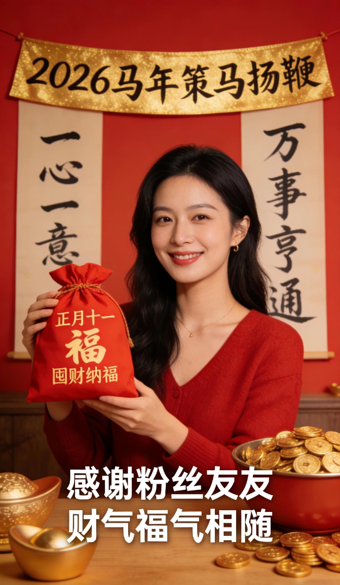 🧧正月十一 囤财纳福,万事亨通! 十一寓意“一心一意”,今日宜囤财,宜纳福。 愿你新的一年,守住一心一意的初心,赚得盆满钵满的财运。 马年策马扬鞭,求财得财,求福得福,日子红火不停歇! 感谢我的粉丝和友友们,愿这份财气福气,与你们紧紧相随! 正月十一囤财 马年招财